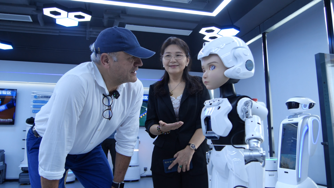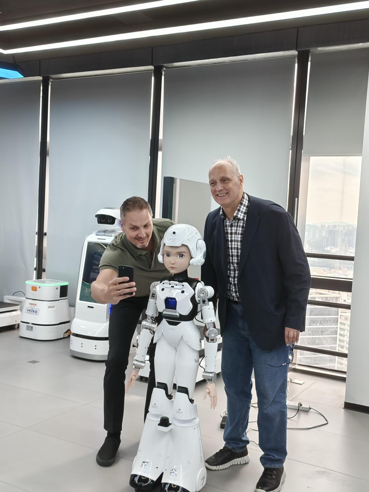 代表团成员与机器人合影。