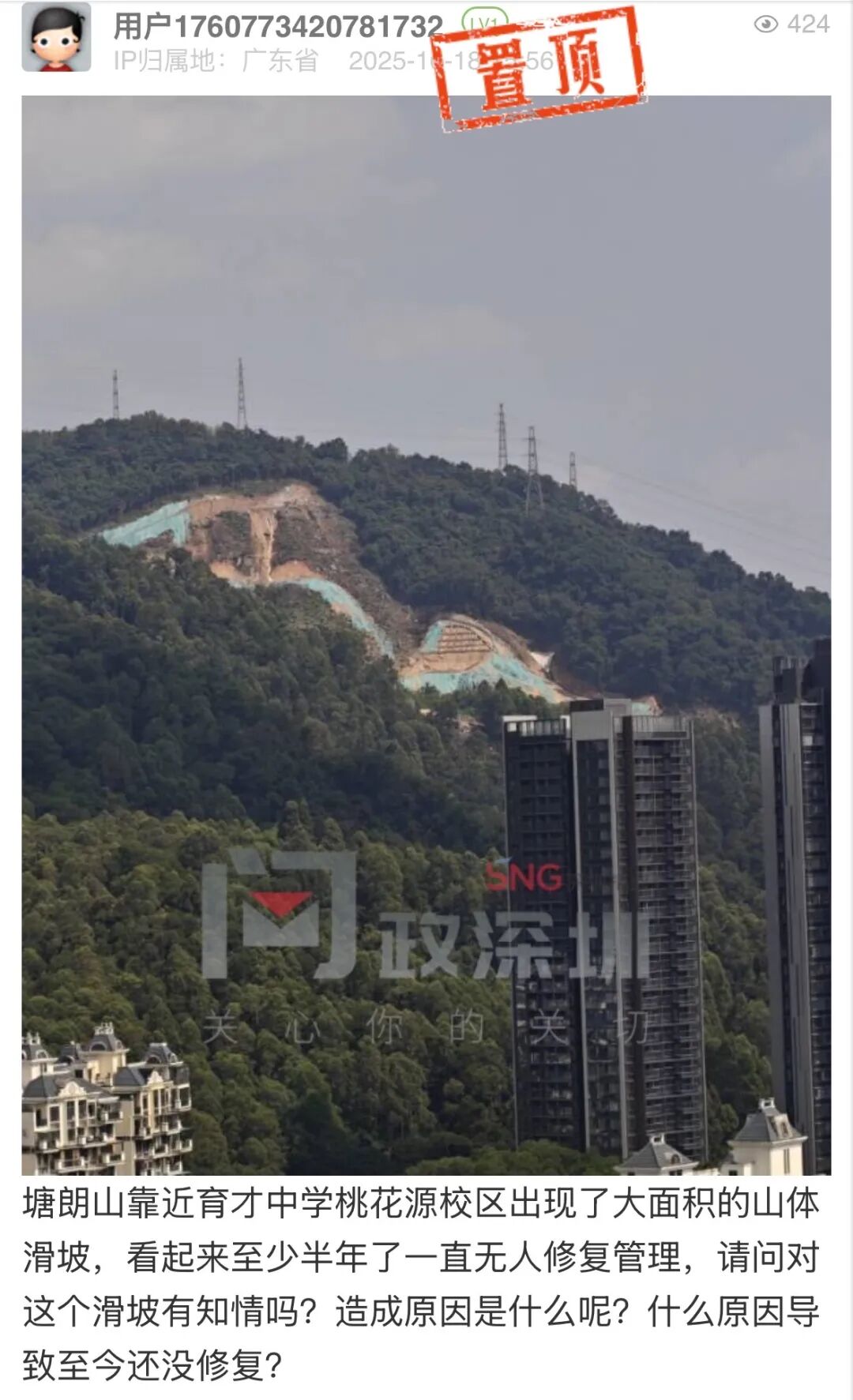 近日,有深圳市民在《问政深圳》发帖称:“深圳塘朗山山体滑坡无人管?”该市民表示,塘朗山靠近育才中学桃花源校区出现了大面积的山体滑坡,看起来至少半年了一直无人修复管理,针对该滑坡区域至今尚未完成修复的原因是什么?👉新闻详情