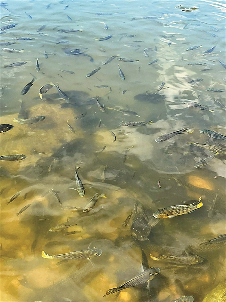 仙湖作為仙湖植物園的核心水域,由梧桐山泉匯流谷底而成,面積約13.8公頃,串聯多個景觀池塘,是園區生態系統的關鍵組成部分。記者沿着仙湖水岸行走觀察時發現,淺水區有成群黃褐色魚類游動,每隔數米便可見到“清道夫”的活動蹤跡,它們穿梭於青草旁、石縫間,體型從10餘厘米至40厘米不等,體態肥碩、布滿黑色斑點,游動時緊貼湖底,遇驚擾便迅速潛入深水區。