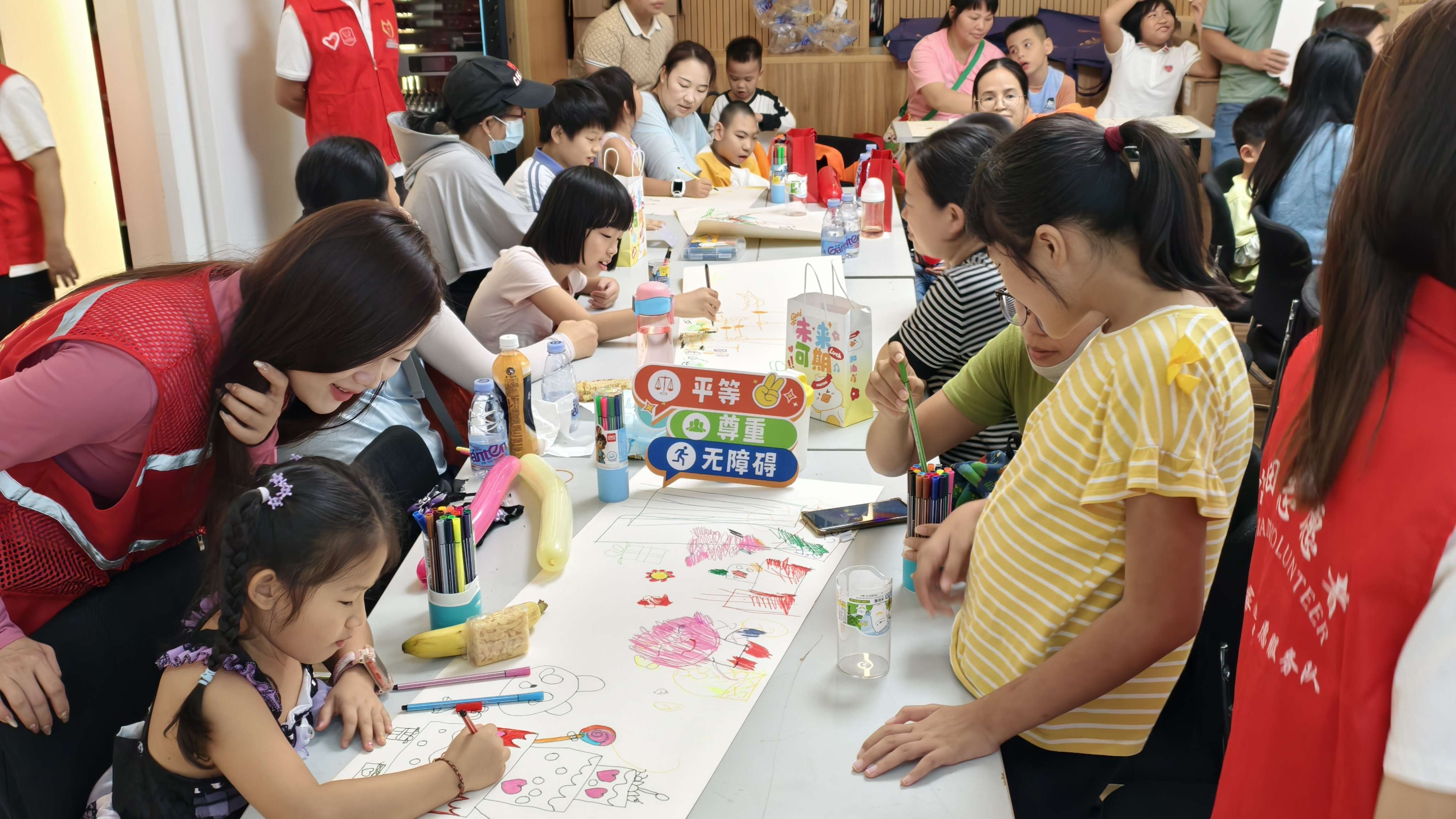在小葛老師帶領下,志願者們陪伴慢天使寶寶集體創作《我們的色彩世界》繪畫作品,志願者素素姐姐握起凱凱的小手教他握緊畫筆,並在畫布上畫出幾朵鮮花。有的孩子畫出了彩虹,有的畫出了太陽,還有的畫出了手牽着手的幸福一家人。這些看似稚嫩的筆觸,卻是他們內心世界真實的表達。