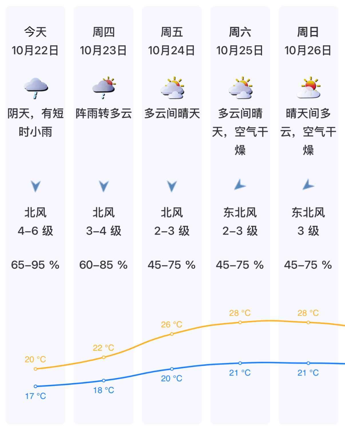 10月22日,将是本轮降温过程中体感最阴凉的一天。天气以阴天为主,伴有短时小雨,气温将在17-20℃之间徘徊,日温差极小。