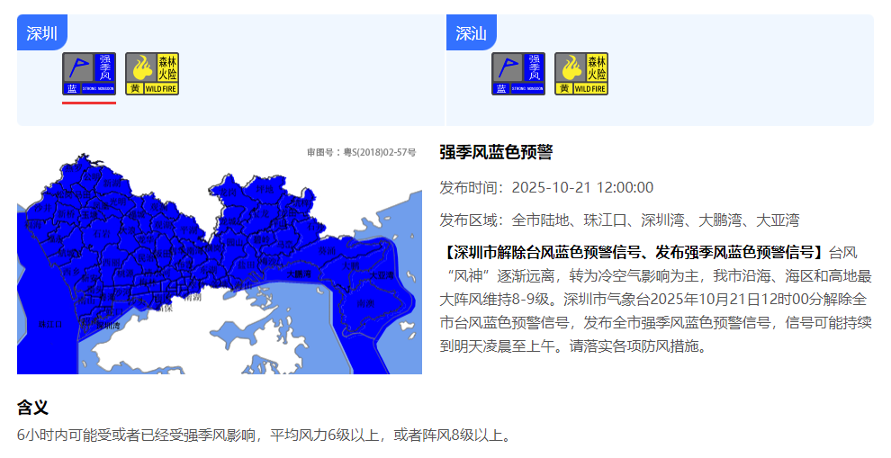目前,深圳市已解除台风蓝色预警信号,全市强季风蓝色预警信号生效中,需继续做好防风和疾病预防相关工作。