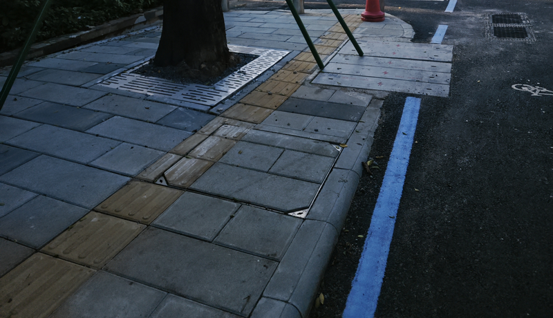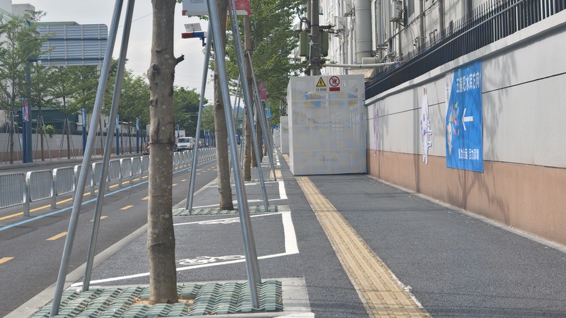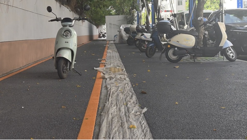 更令人担忧的是,部分盲道的塑料保护膜仍未撕去,表面光滑,在阴雨天气下,行人走过时容易打滑。路过的居民心有余悸地说:“这保护膜本该施工后及时清理,现在却成了安全隐患。台风期间,自己就在此吃过亏。”