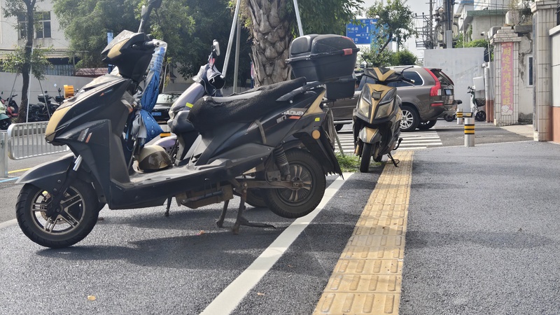 其次,人行道上电动自行车乱停放问题突出。晶报记者抵达时为上午10点多,人行道几乎被电动自行车“占领”,车辆随意停放,有的甚至堵住了盲道和主要通道。行人不得不穿梭于车缝中,或冒险走上机动车道。