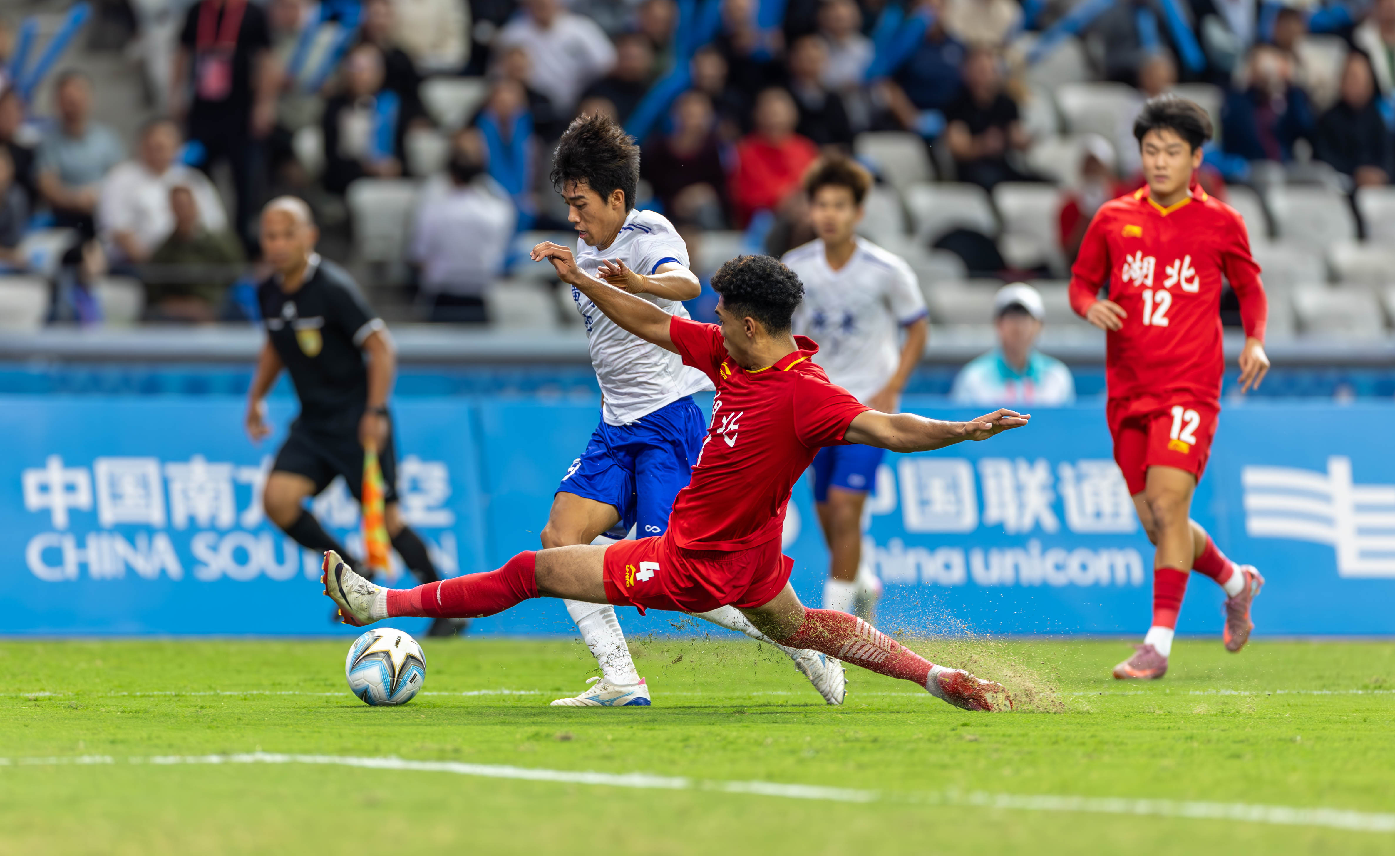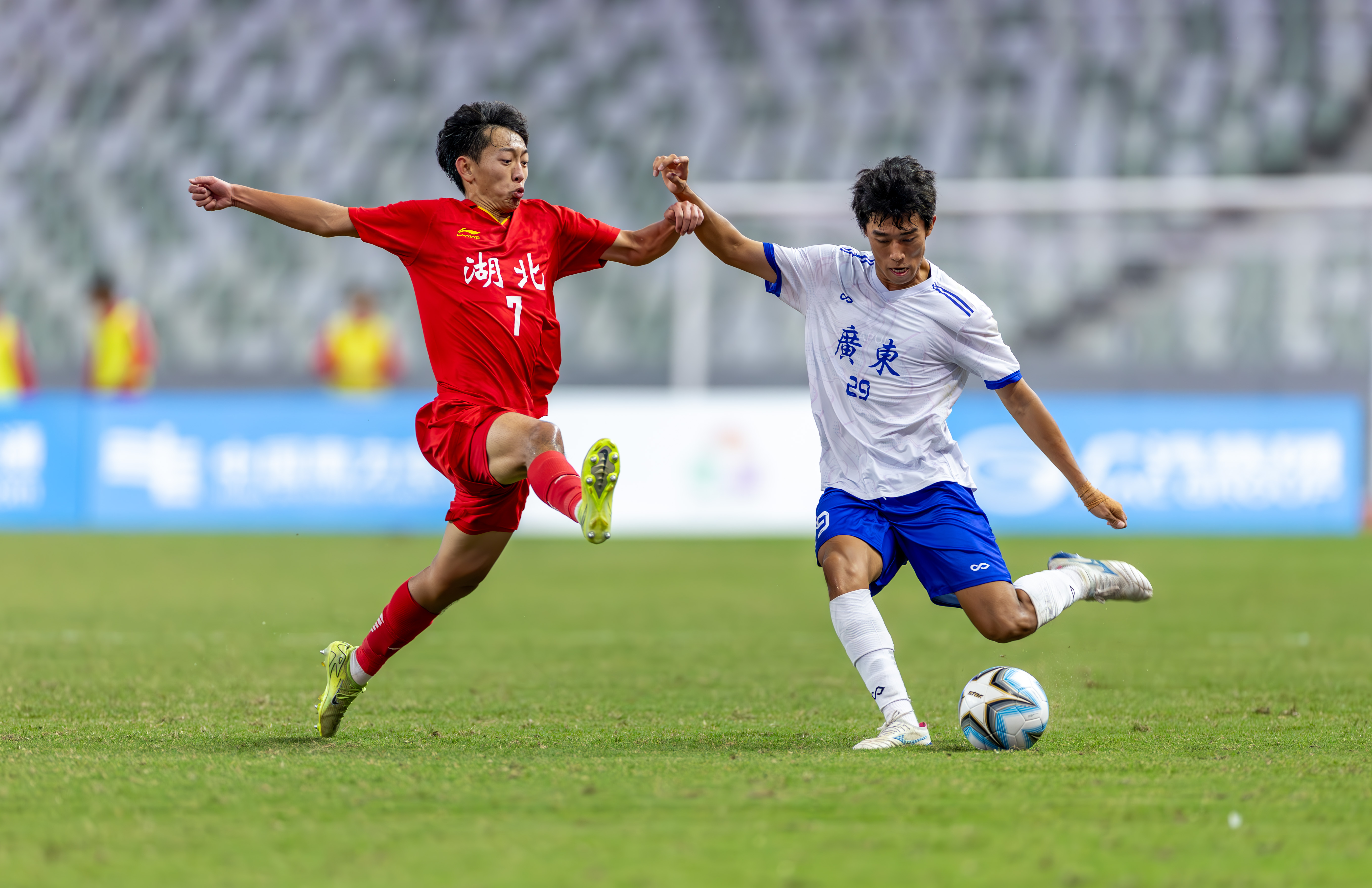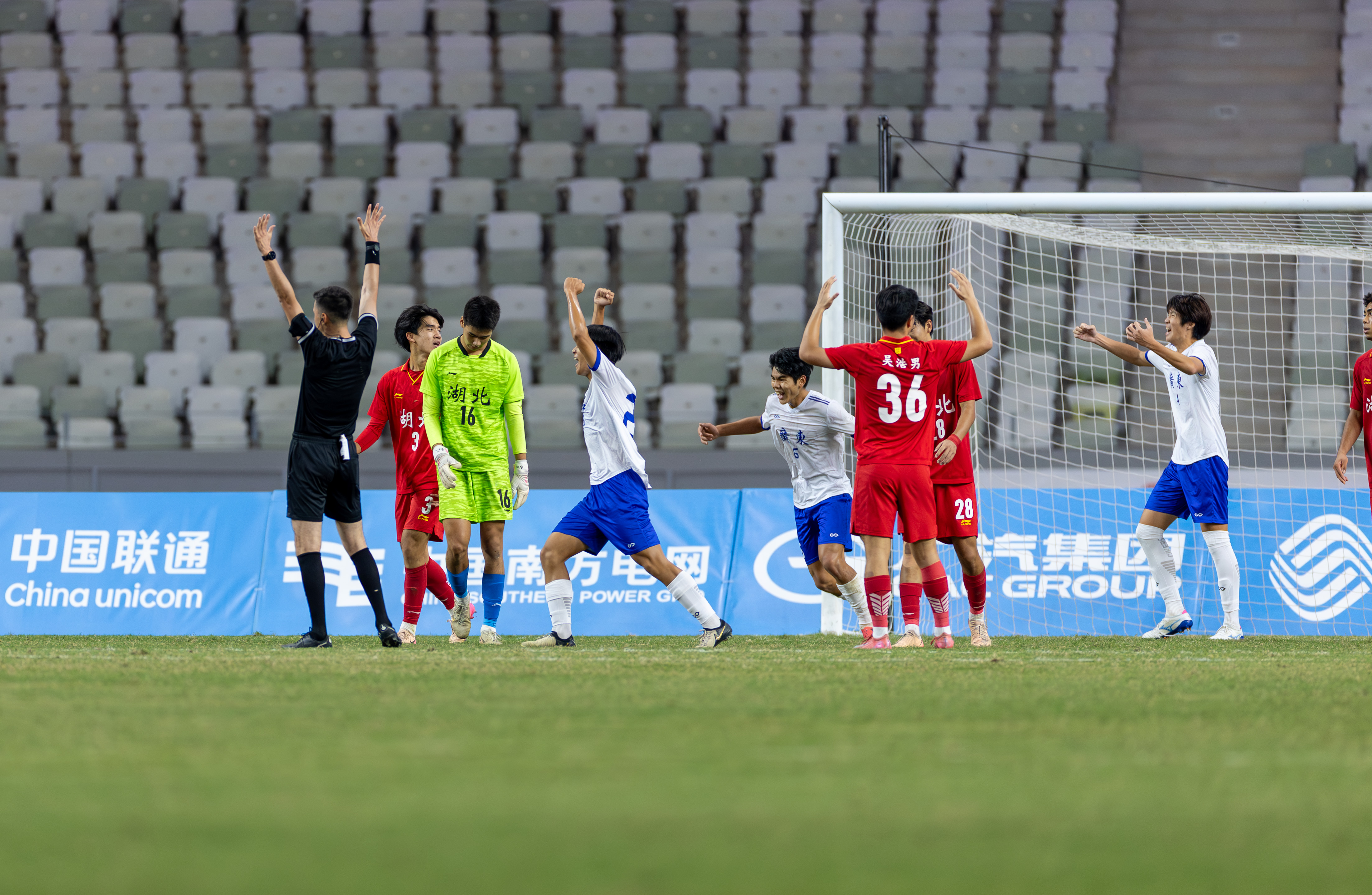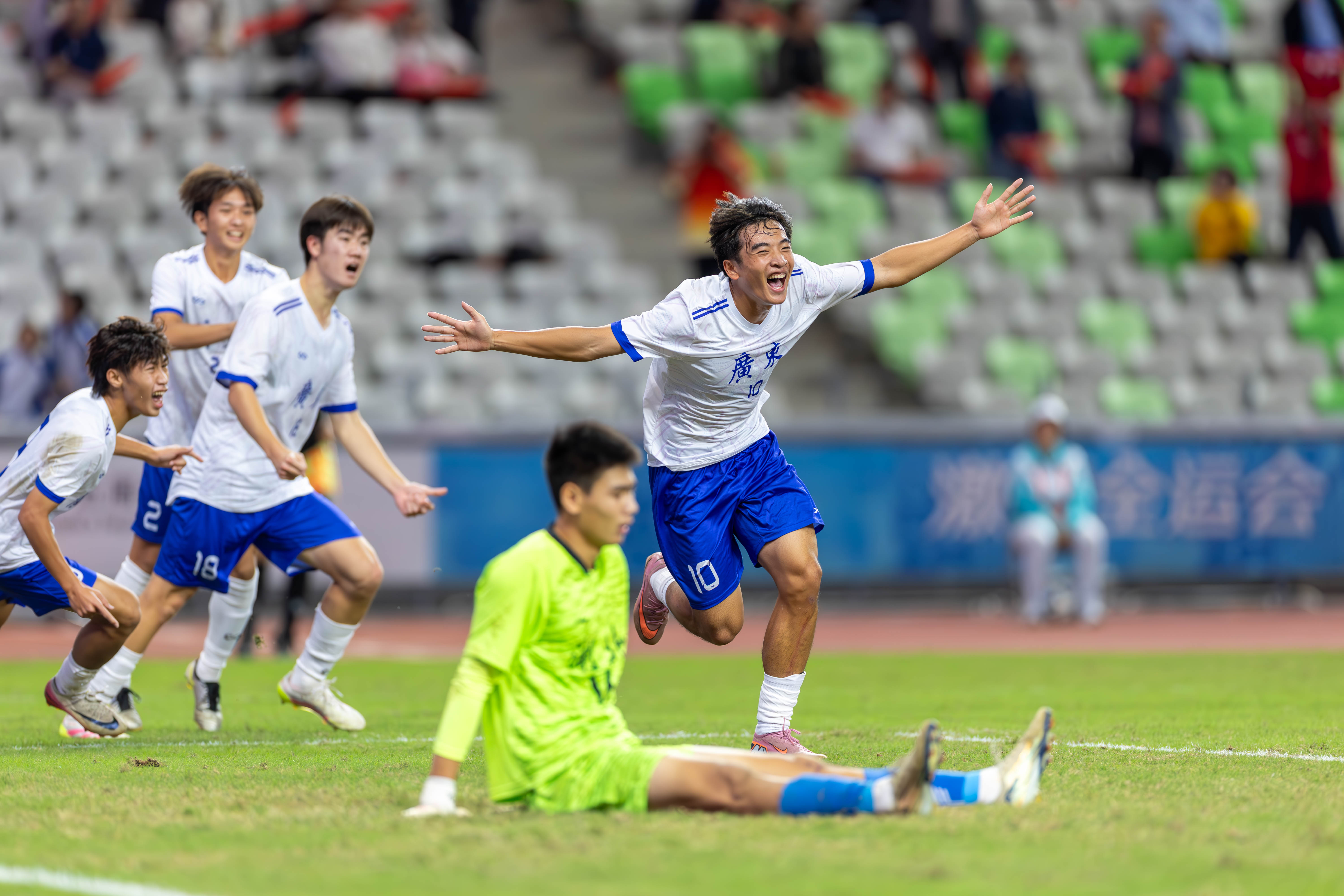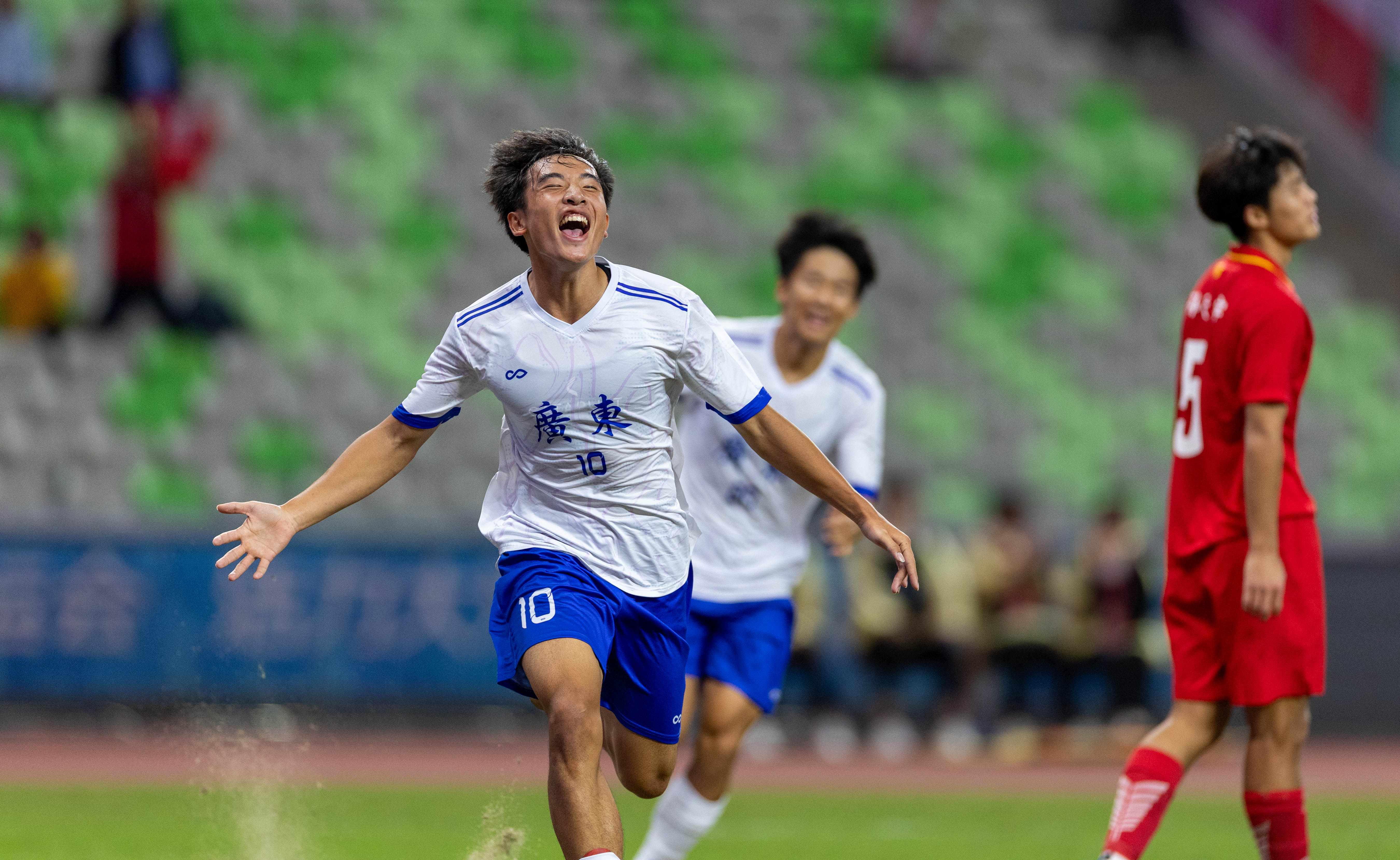 10月21日,十五运U18男足广东队对阵湖北队的比赛在深圳宝安竹林体育场举办。90分钟的比赛中,湖北队10号凭借倒挂金钩进球,在上半场扳平比分;广东队10号球员则凭借轻巧推射破门,在下半场83分绝杀湖北队。这场比赛最终广东2-1绝杀湖北,携手江苏、辽宁、山东进四强。