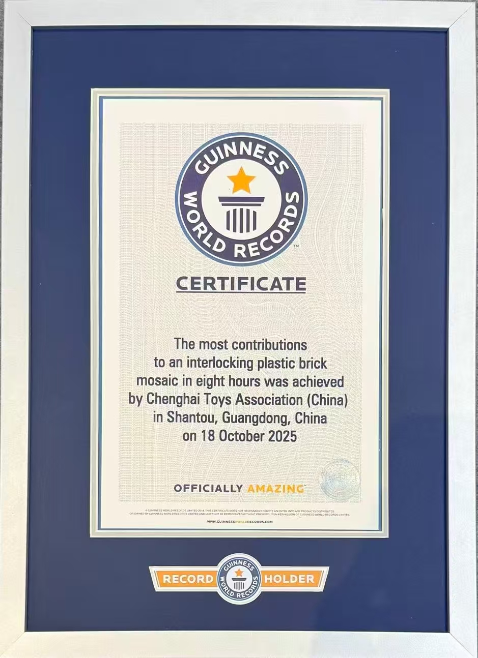 作为第24届汕头·澄海国际玩具礼品博览会(下称“玩博会”)系列活动之一,澄海玩具协会联合全国玩具行业产教融合共同体,以卓越的创造力与产教协同能力,成功挑战此项吉尼斯世界纪录。本次完成的作品以“百城百校”为主题,邀请了来自全国院校1860位师生,用超过一百四十万颗积木,在8小时内拼出了大江南北的城市文化和院校底蕴以及“汕头人民欢迎您”的字样。该作品长18米,高5米,以极具视觉冲击力的巨型设计长卷,刷新了全球对澄海玩具产业创新能力的认知。这不仅是艺术的呈现,更是澄海玩具产业创新实力的精彩展示,以里程碑式的行动,生动诠释了澄海玩具从“制造”到“创造”的转型升级。