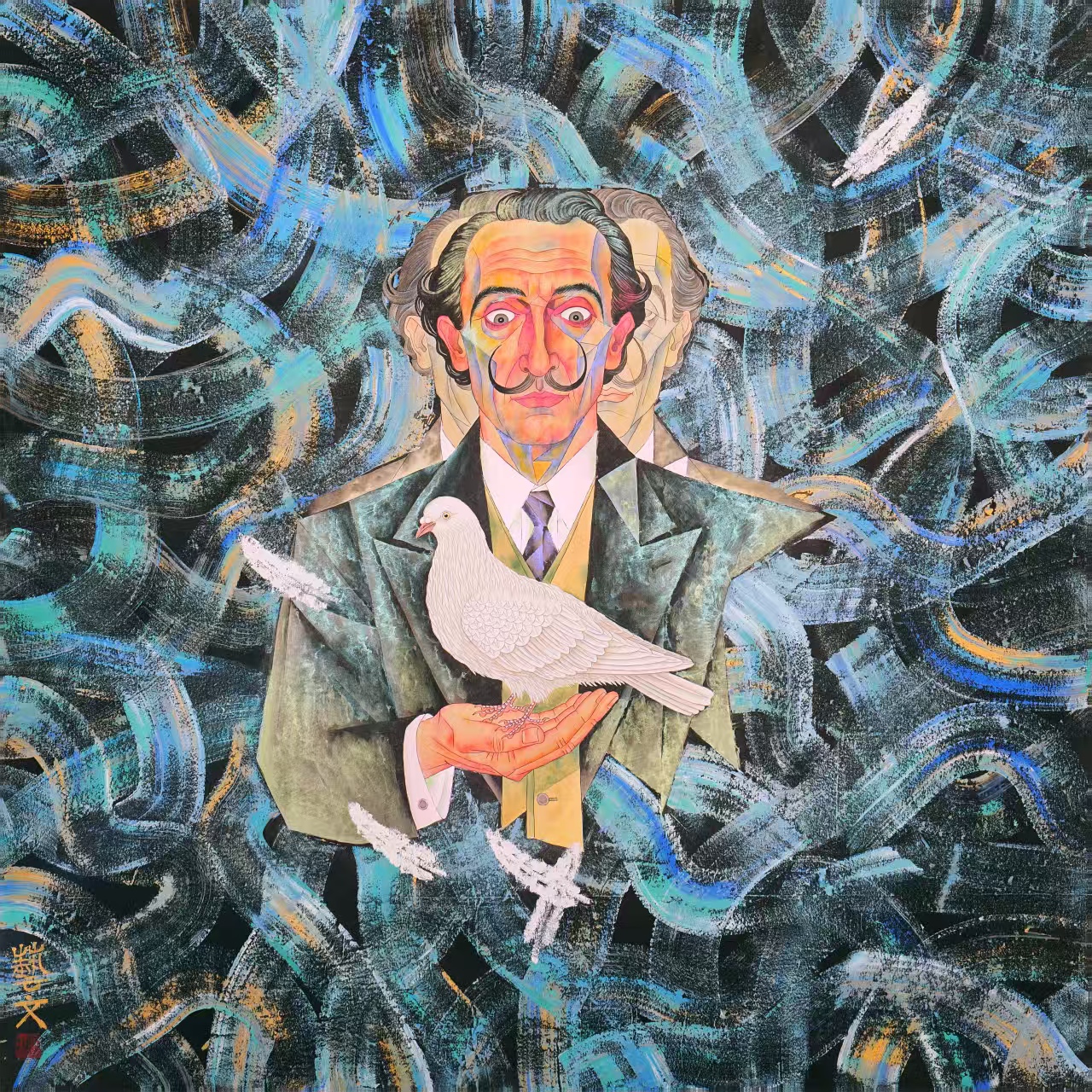 《达利意象》是周艺文“新文艺复兴”当代艺术运动的代表作之一。达利手托白鸽的瞬间被凝固定格,背景不规则粗线肌理,白鸽作为自由的象征,指引观者在严谨笔法与荒诞构图的张力间,探寻超越文化的当代艺术思潮。周艺文重构了历史与当代的语境,蓝色的曲线既是历史的轨迹,又是当代的走向,白色的羽毛与鸽子是周艺文灵魂的符号。