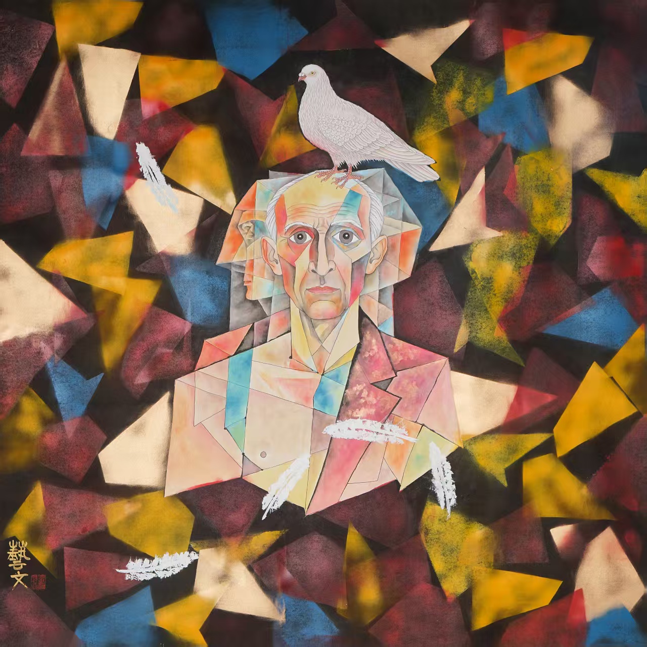 周艺文是近年来在欧美引起较大关注的中国著名当代艺术家,他提出“新文艺复兴”当代艺术运动。“欧洲文艺复兴”及其之后的诸多元素,在周艺文的创作里成为一种历史材料,被重新处理、叠加或变形,使他们获得了新的身份-新的启蒙角色。《毕加索意象》是他这一时期的代表作之一,周艺文与毕加索进行跨越时空的灵魂对话。几何切面之间,白鸽立于混沌的形体之上,羽片浸染着宣纸温润的暖色,那些被拆解的轮廓在赭石与琥珀的调和中重新获得平衡,照见破碎与完整的辩证。作品在一个时空里重构了周艺文与毕加索的空间、色彩与线的关系。