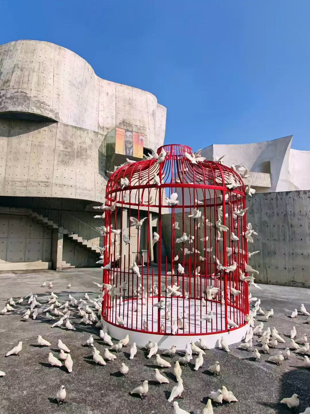 《开放的鸟笼》则以解构主义手法颠覆传统装置形式:巨型鸟笼的金属框架被刻意“打开”,鸟笼外部与内部布满了白色鸽子,象征冲破束缚的渴望。周艺文通过材质对比,冷硬的金属与柔软的羽毛营造出静谧与热烈并存的美学张力。与毕加索1949年为巴黎世界和平大会创作的《和平鸽》形成呼应,诠释现代艺术对“自由”的多元理解。