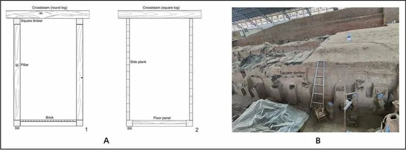 陪葬坑过洞主要木质框架结构示意图(A1:兵马俑坑;A2:K9901及K9801)及兵马俑一号坑内炭化木质建筑结构。秦始皇帝陵博物院供图