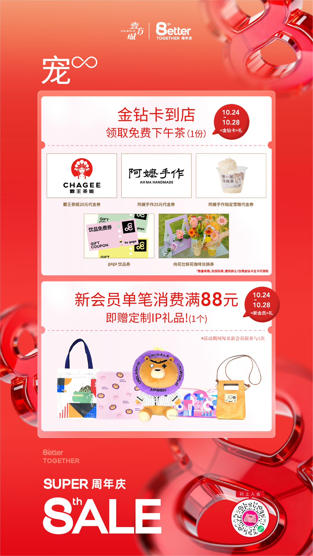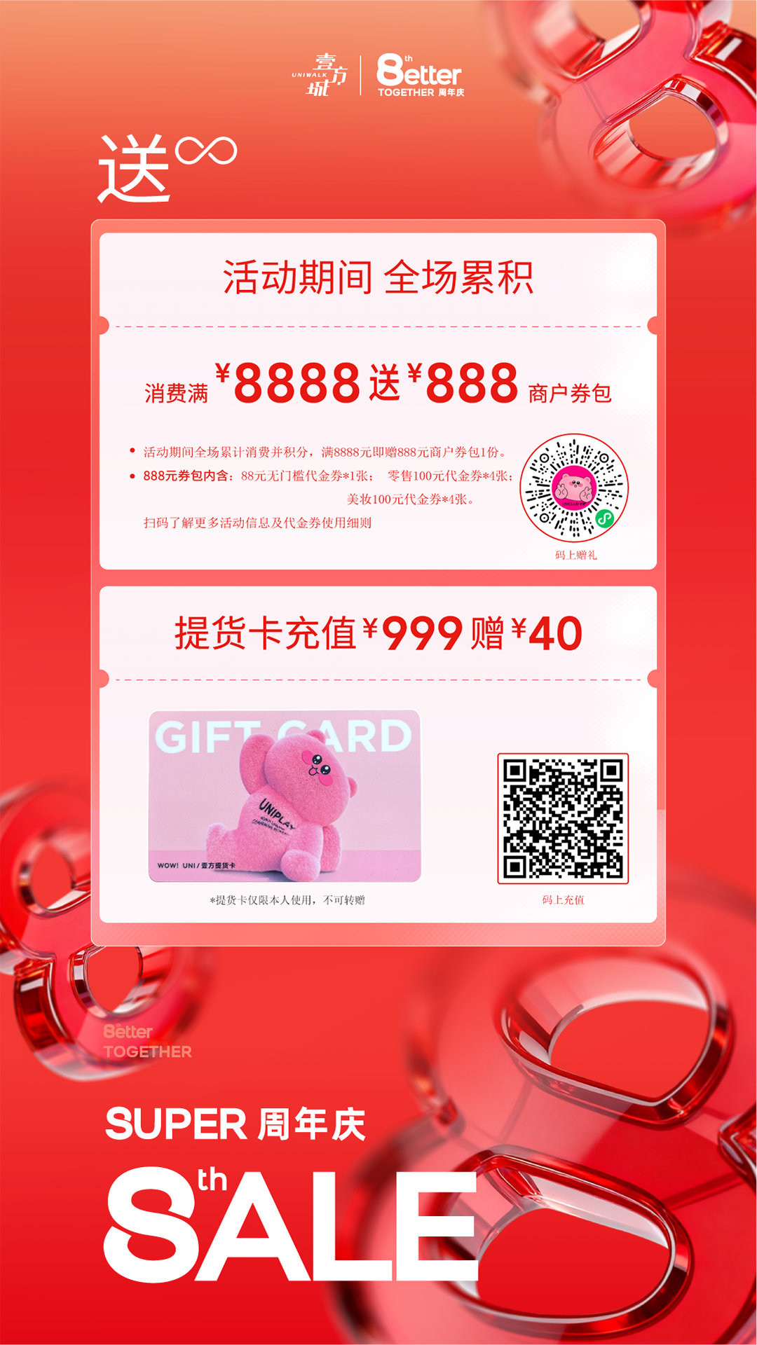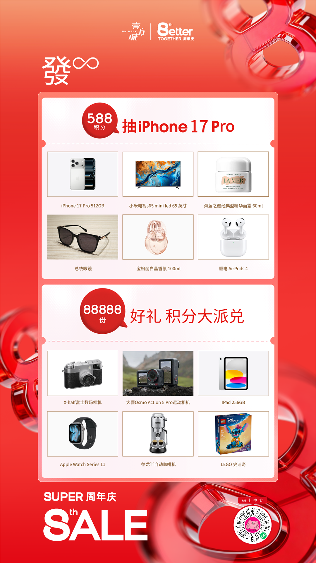 会员专享福利也不能少。会员到店任意消费并积分,即可享5小时免费停车。会员满588积分可抽奖,100%中奖,最高可得iPhone17 Pro Max。此外,还有88888份庆生好礼等你来换,8积分即可兑换;积分限时当钱花,会员专享3000积分兑100元提货卡,超划算。在活动期间,市民在UNI精致丽人单笔消费满8888元,即赠888元商户券包,店铺新会员花88元,就能领壹方定制IP礼品;金钻卡会员到店,可免费领取精致下午茶。
