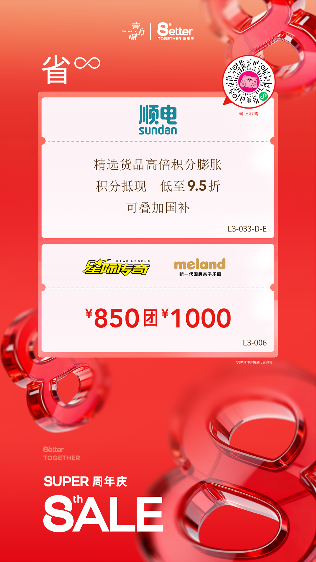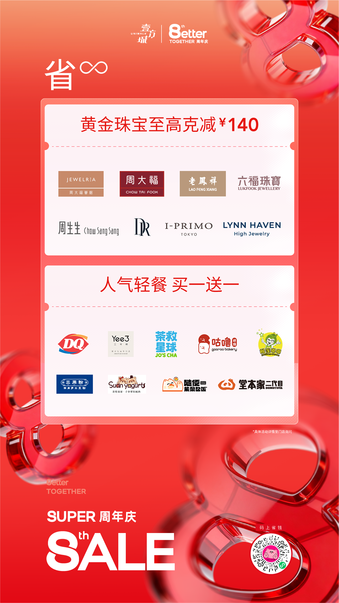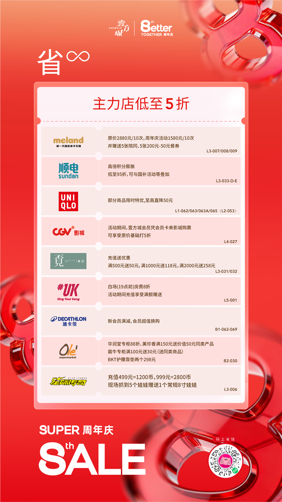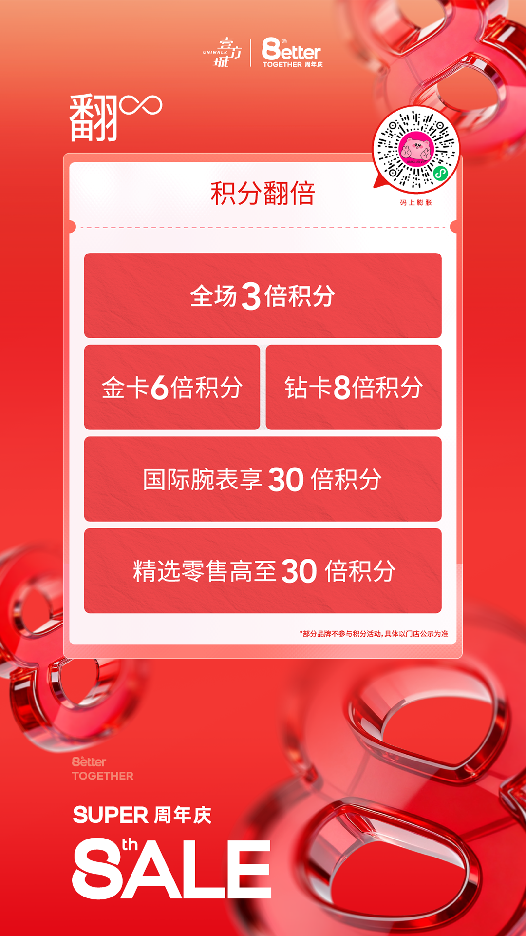 会员专享福利也不能少。会员到店任意消费并积分,即可享5小时免费停车。会员满588积分可抽奖,100%中奖,最高可得iPhone17 Pro Max。此外,还有88888份庆生好礼等你来换,8积分即可兑换;积分限时当钱花,会员专享3000积分兑100元提货卡,超划算。在活动期间,市民在UNI精致丽人单笔消费满8888元,即赠888元商户券包,店铺新会员花88元,就能领壹方定制IP礼品;金钻卡会员到店,可免费领取精致下午茶。