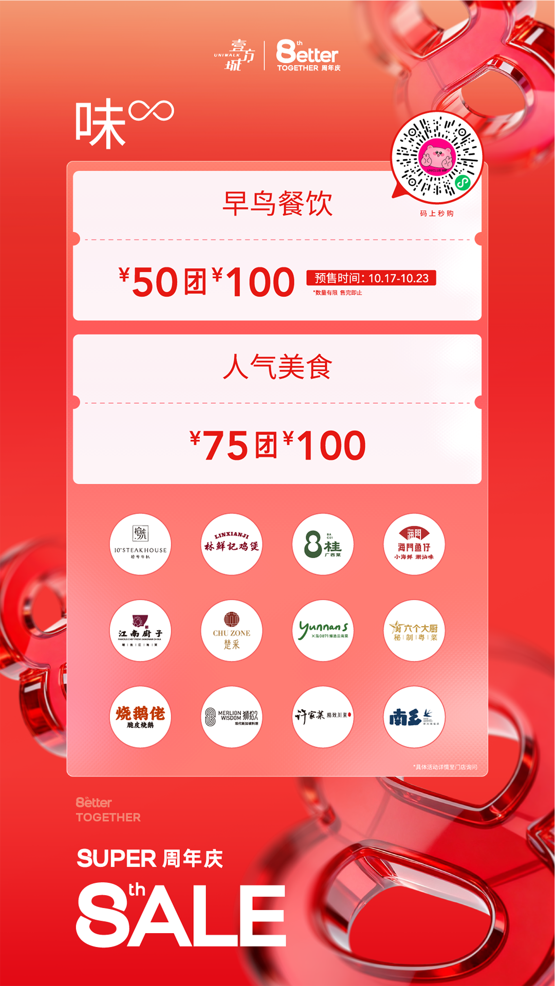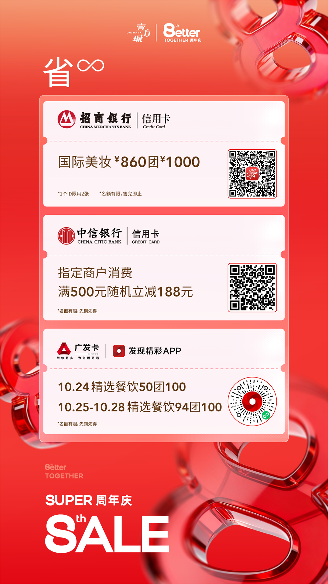 前海壹方城店庆期间,美妆团券享8.8折,零售服饰低至5折,人气美食低至5折,星际传奇、Meland Club专享850团1000。银行也来助力啦!招商银行美妆团券限时860团1000,中信银行购物随机立减188元,广发银行人气餐饮低至5折。市民购买提货卡也有惊喜,充999元即赠40元,多充多赠叠折扣,轻松实现购物自由。此外,积分限时翻倍,全场享倍积分,金卡会员专享6倍积分、钻卡享8倍积分,国际腕表最高翻至30倍积分。