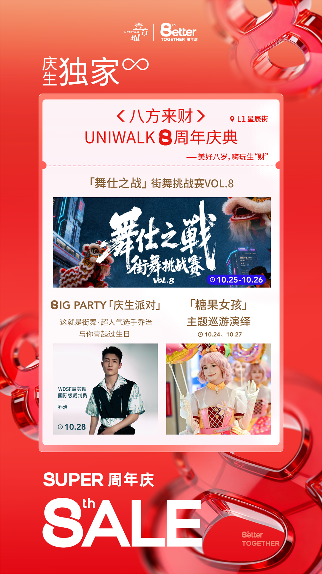 除了3大IP,庆生派对上的节目更是一个比一个燃。10月28日18:00-19:30,L1星辰街舞台的“八方来财”生日派对绝对是重头戏!《这就是街舞》明星嘉宾乔治将空降现场,用超炸的舞姿点燃全场,还有6米巨型生日蛋糕请全城免费吃。