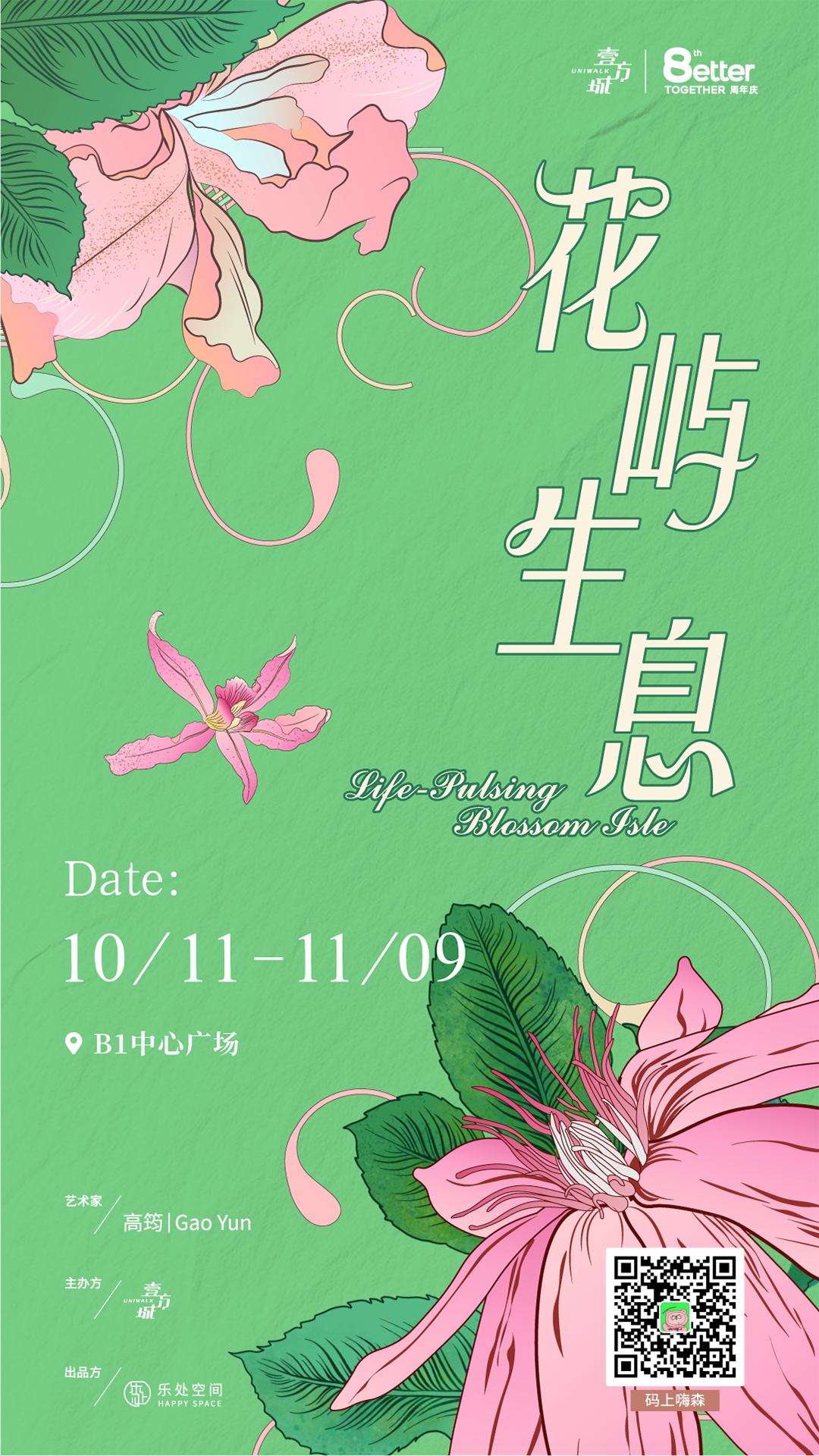 ▲B1中心广场的“花屿生息”装置艺术展海报。