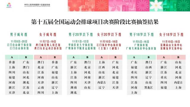 第十五届全运会女排成年组比赛将于11月7日至19日在中国澳门举行,小组赛采用单循环赛制,各小组前四名晋级八强。