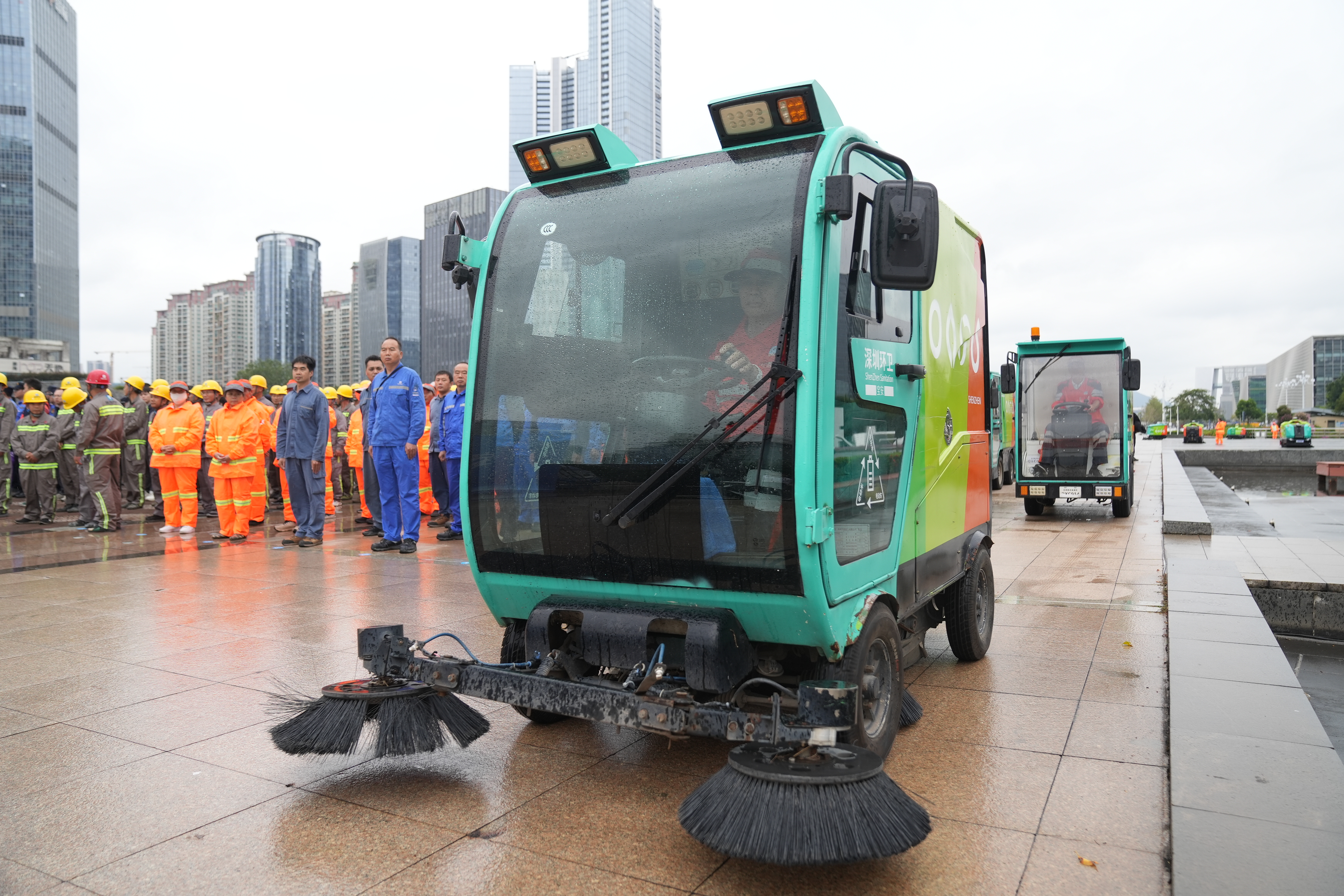 ▲环卫作业车辆从海滨广场出发,清理道路卫生。