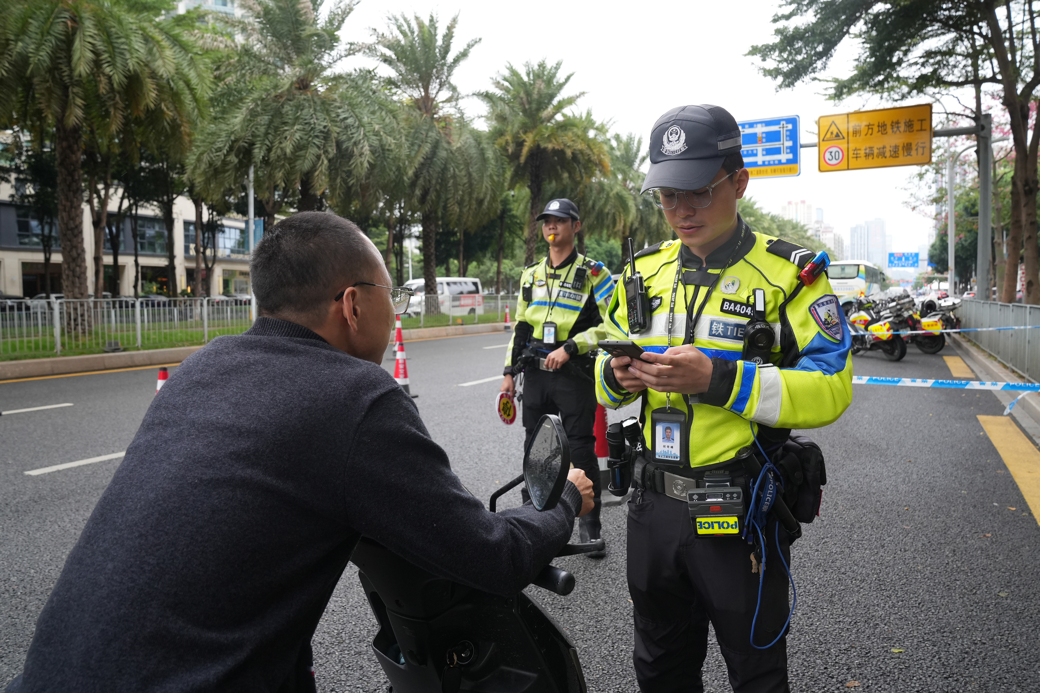 ▲宝安交警在创业一路值守,对未戴头盔在机动车道上骑行非机动车的人员进行处理。