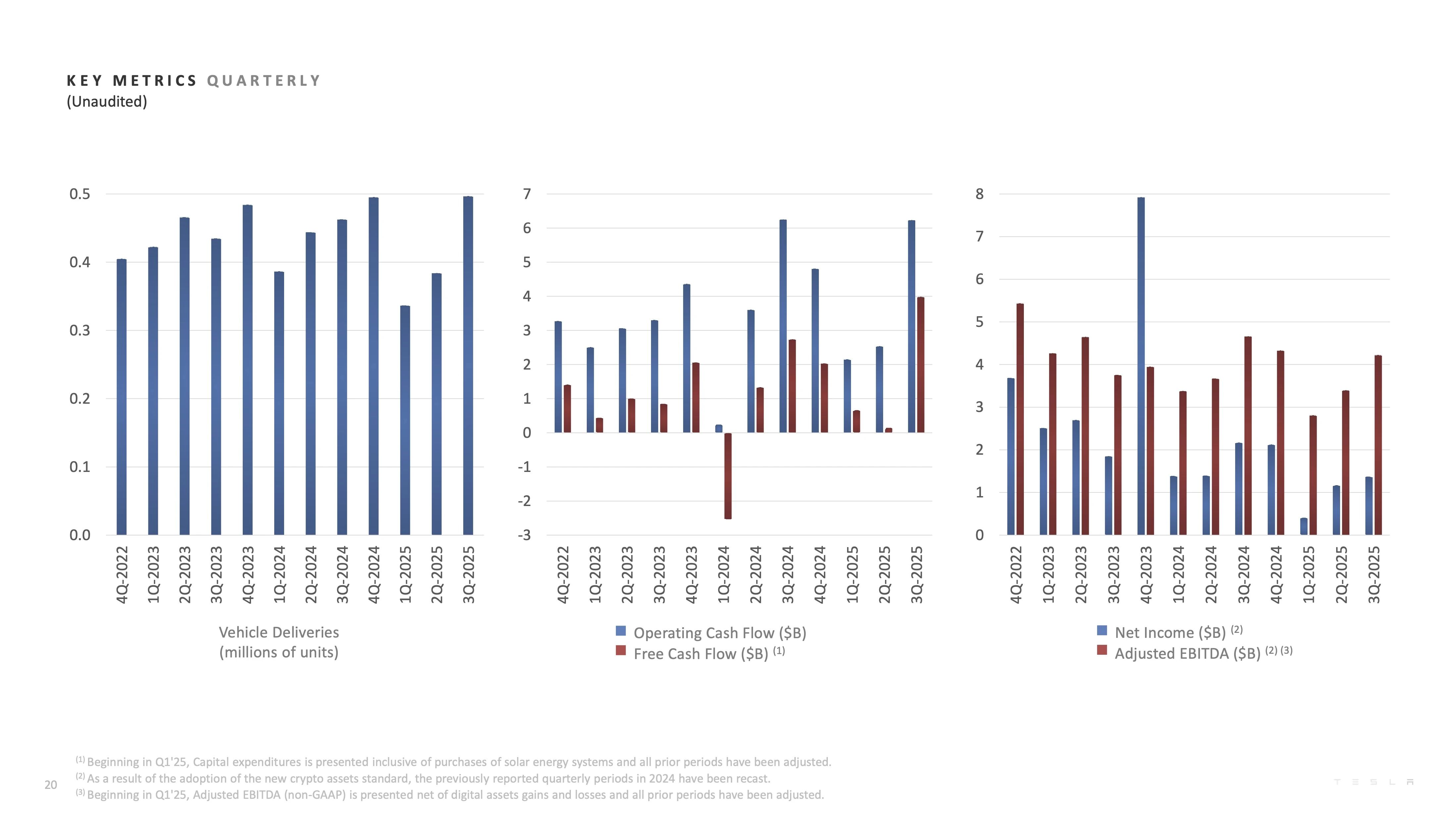 10月23日,特斯拉公布2025第三季度财报。特斯拉第三季度营收281亿美元,同比增长12%,超于预估的263.6亿美元。但利润下降,三季度调整后净利润17.7亿美元,同比下降29%,二季度同比下降23%。