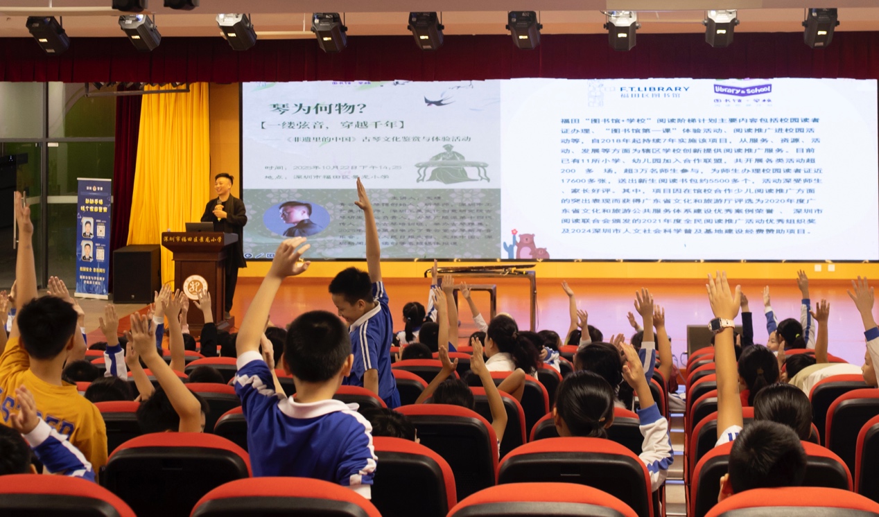 10月22日下午,由福田区图书馆主办的“琴为何物?【一缕弦音,穿越千年】——《非遗里的中国》古琴文化鉴赏与体验活动”在深圳市福田区景龙小学成功举办。作为福田“图书馆+学校”阅读阶梯计划的特色活动,本次活动打破书页边界,以沉浸式体验让学生们近距离触摸古琴非遗文化的魅力,感受中华优秀传统文化的深厚底蕴。