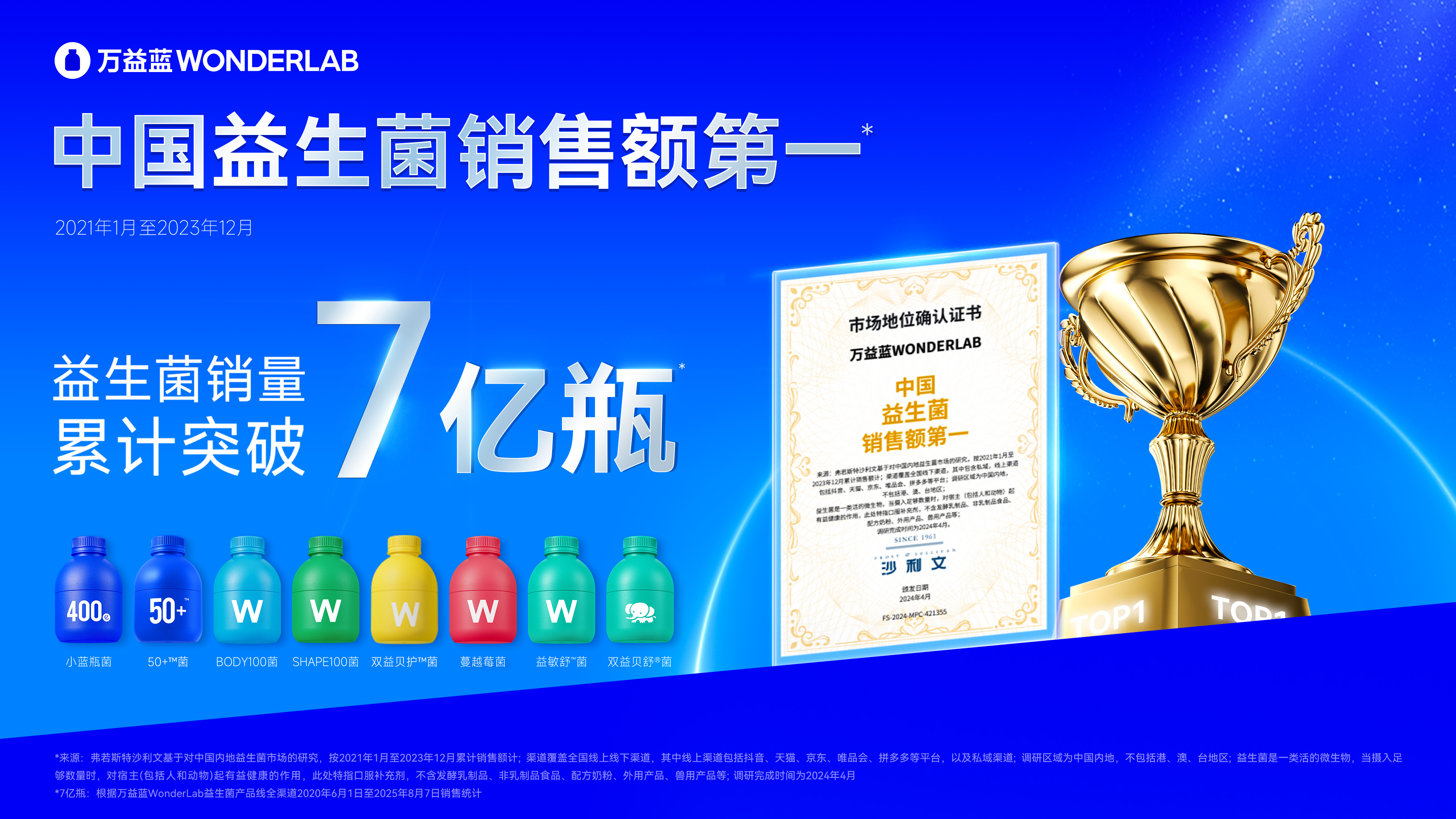 作为国内益生菌行业头部企业,又是深圳本土大健康代表企业,万益蓝始终坚持生物科技创新,始终以“临床实测”和“可循证”作为产品发展核心逻辑。2024年4月,著名的全球增长咨询公司弗若斯特沙利文将“中国益生菌销售额第一”的荣誉颁给万益蓝,确定了它的市场地位。