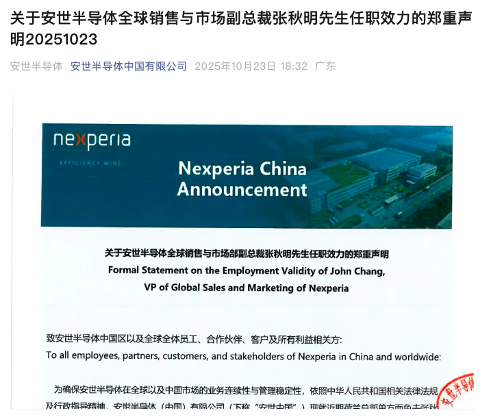 10月23日晚,安世半导体中国有限公司官方微信公众号发布关于安世半导体全球销售与市场副总裁张秋明先生任职效力的郑重声明。