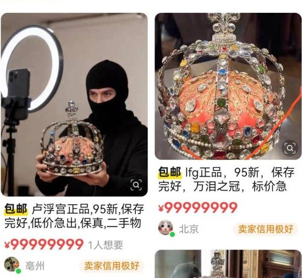 近日,法国巴黎卢浮宫博物馆遭遇盗抢,多件珍贵藏品失窃。10月22日,现代快报记者发现,在二手平台闲鱼上有多个“卢浮宫博物馆被盗珠宝”售卖链接,标价从99万元到9999万元不等,链接文案中还有“9.5新,现货在手、刚取货,低价急出”等描述。👉新闻详情
