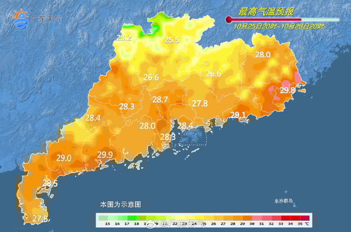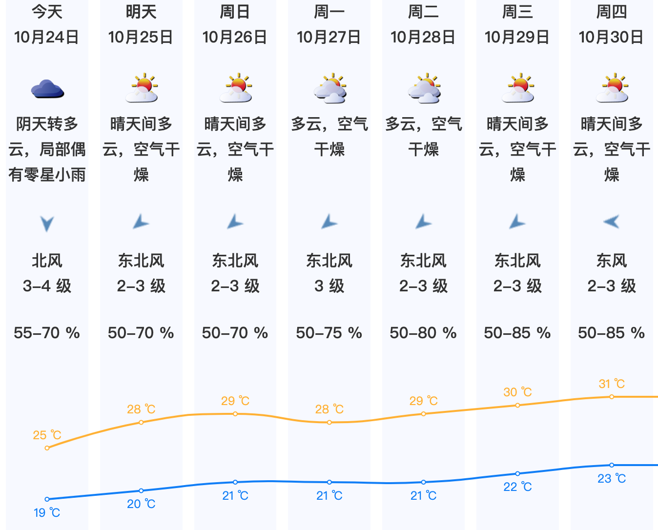 25-26日,广东省大部分市县多云间晴。气温继续回升,昼夜温差加大,最低气温:粤北市县16-18℃,南部沿海市县20-22℃,其余市县18-20℃。