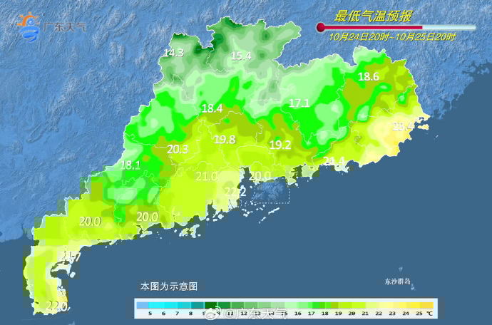 24日,粤西市县多云到阴天,部分市县有零星小雨,其余市县多云。气温开始回升,最低气温:粤北和珠江三角洲北部市县14-16℃,南部沿海市县18-20℃,其余市县16-18℃。
