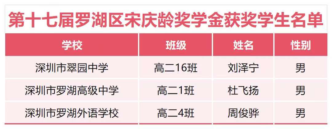 广东省宋庆龄奖学金由省宋庆龄基金会与省教育厅于2009年联合设立,每年评选一次,按全省高二学生人数千分之一核定名额,竞争激烈。经评审委员会审议、主席会议确认及网上公示等严格程序,此次罗湖区翠园中学、罗湖高级中学、罗湖外语学校各有1名学生成功入选,充分展现了罗湖学子在品德修养、学业成绩与综合素质方面的卓越水平。