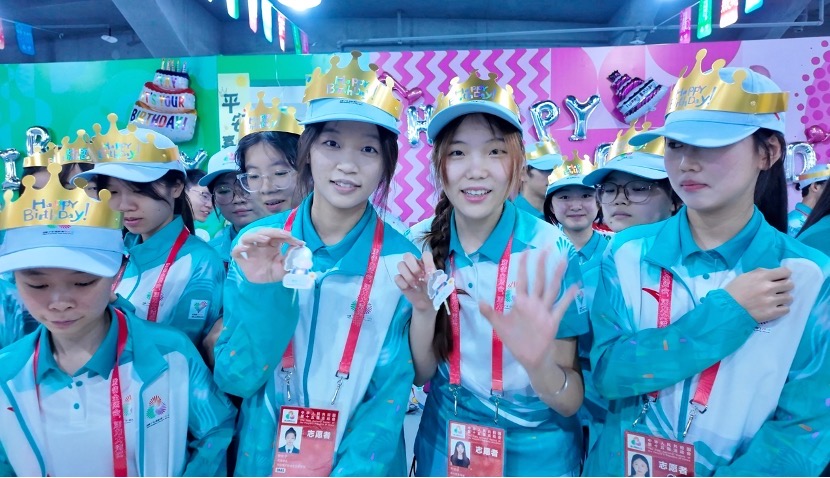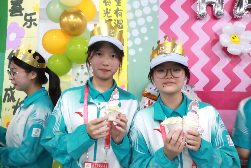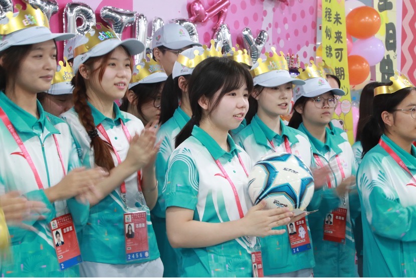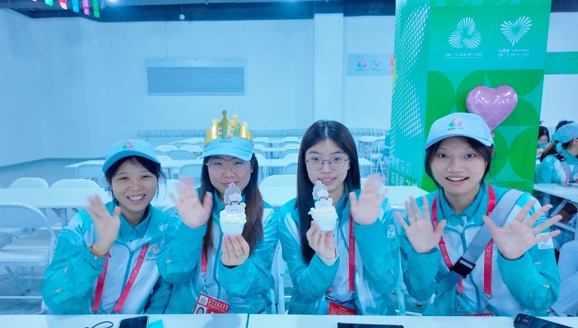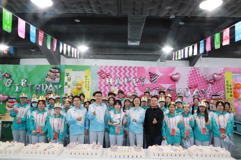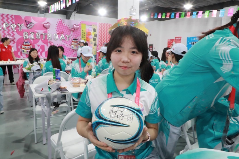 “你们守护赛事,我们守护你们。”秉持这样的服务理念,团区委在细致做好物资保障的同时,更注重对志愿者精神上的尊重与情感上的关怀。为进一步增强志愿者的归属感和幸福感,团区委特意为10月份过生日的50余名“小海豚”策划了一场温馨的集体生日会。现场不仅准备了印有十五运吉祥物的定制生日蛋糕,还为每位寿星定制了专属卡通人像立牌,让生日祝福更具个性与纪念意义。更让志愿者们惊喜的是,生日会当天过生日的“小寿星”,还收到了带有广东队队长潘锘均亲笔签名的足球,这份特别的礼物引来阵阵欢呼与感动。