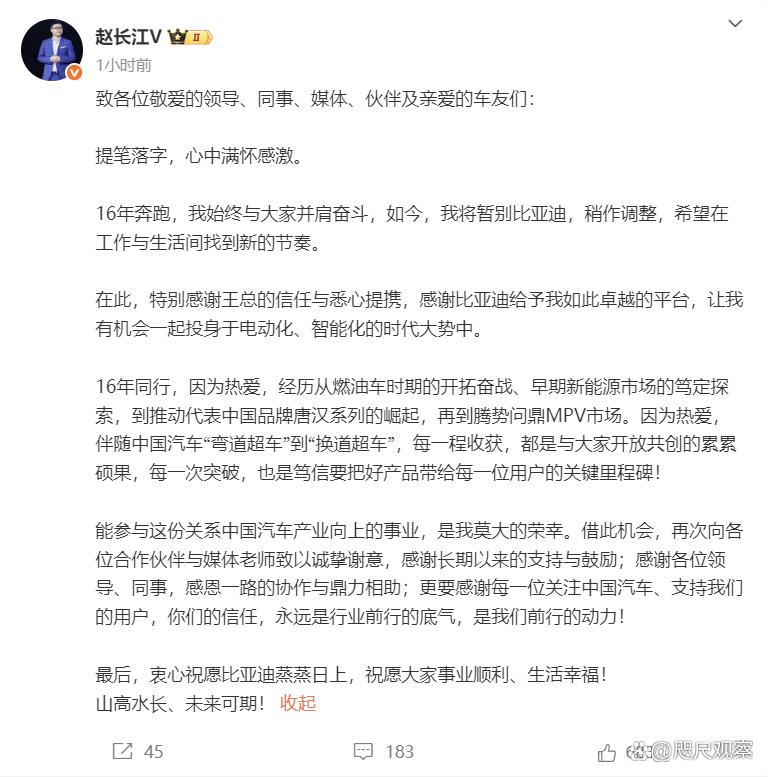 对于赵长江离开比亚迪后的去处,有消息称,其将入职奇瑞旗下智界品牌。不过,该消息尚未得到其本人确认。