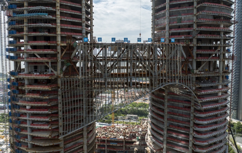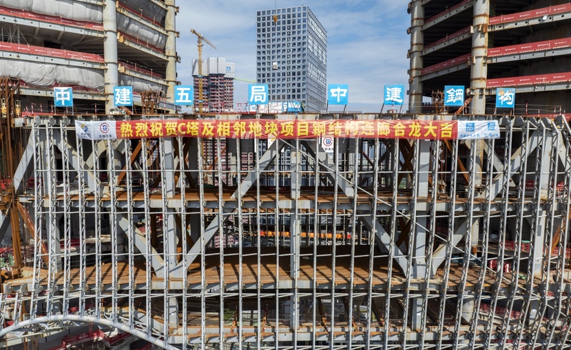 “目前东塔核心筒已施工至61层,西塔核心筒施工至58层。”中建五局C塔项目副总工程师王新宇介绍说,目前项目6000吨“超高、超跨、超重、超精”钢结构连廊已经顺利合龙,两座塔楼成功牵手相依,项目幕墙单元体首挂,裙楼结构正有序推进。