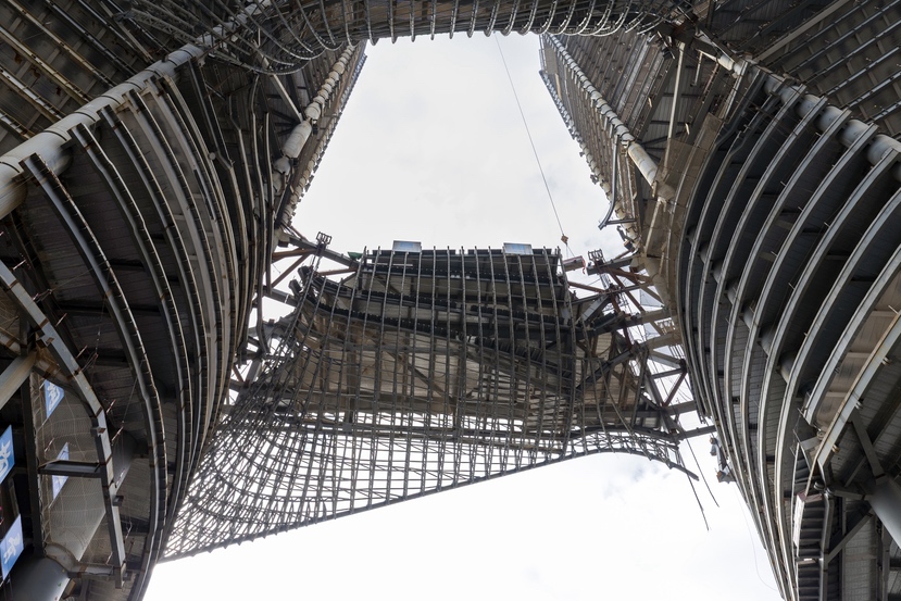 C塔项目为超高层双子塔结构,东、西两座塔楼由上托下挂非对称复杂连廊紧密相连,该连廊具有“超跨、超重、超高、超精”四大特点:即连廊最大跨度达78米,最大提升重量约6000吨,堪比4000辆家用轿车的总重量,整体提升高度约120米,相当于40层普通住宅楼的高度,精度控制严格达到建筑钢结构外观质量AESS4.0级,即精度达毫米级。