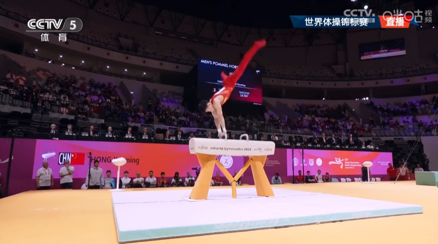 10月24日,在印尼雅加达举行的2025年体操世锦赛上,中国选手洪延明夺得男子鞍马冠军。