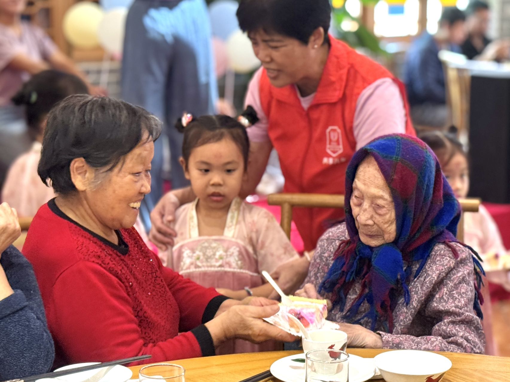 现场气氛热烈而温馨:趣味互动游戏不仅带来了欢声笑语,更增进了邻里情感;幼儿园孩子们稚嫩真诚的表演,传递了童真温暖。专为当月寿星长者举办的集体生日会,将现场氛围推向高潮,一份份甜蜜祝福也送到了长者手中。