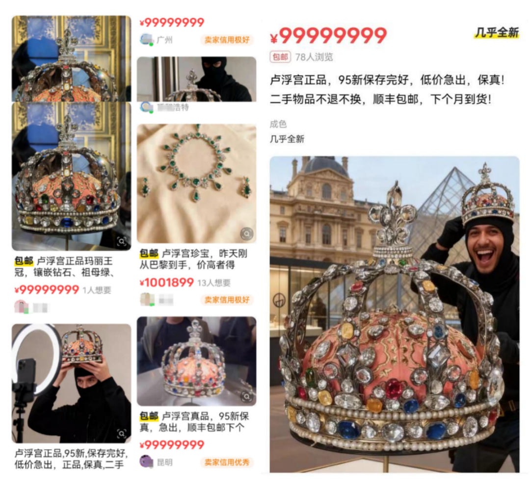 10月22日,国内二手交易平台迅速出现疑似“失窃珠宝”售卖的信息,有多个“卢浮宫博物馆被盗珠宝”售卖链接,标价从99万元到9999万元不等,商品文案充斥“95新、保存完好,低价急出”“卢浮宫珍宝,昨天刚从巴黎到手,价高者得”等表述,部分甚至配上作案图片,刻意关联劫案话题。