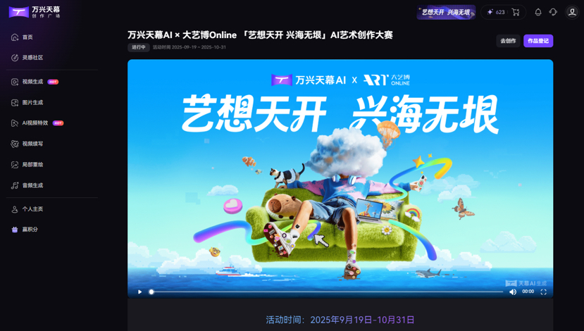 据悉,“全民AI艺术创作大赛”热度持续攀升,作品征集至10月31日截止,已进入最后冲刺阶段。全球创作者可通过万兴天幕创作广场(tomoviee.cn)或万兴天幕AI App创作视频或图像艺术作品,上传至B站、微博、小红书、视频号、抖音、快手任一社交媒体平台,附带#万兴天幕带你登展大艺博#天幕AI双话题,并关注万兴天幕服务号按照指引填入信息,即可完成投稿。