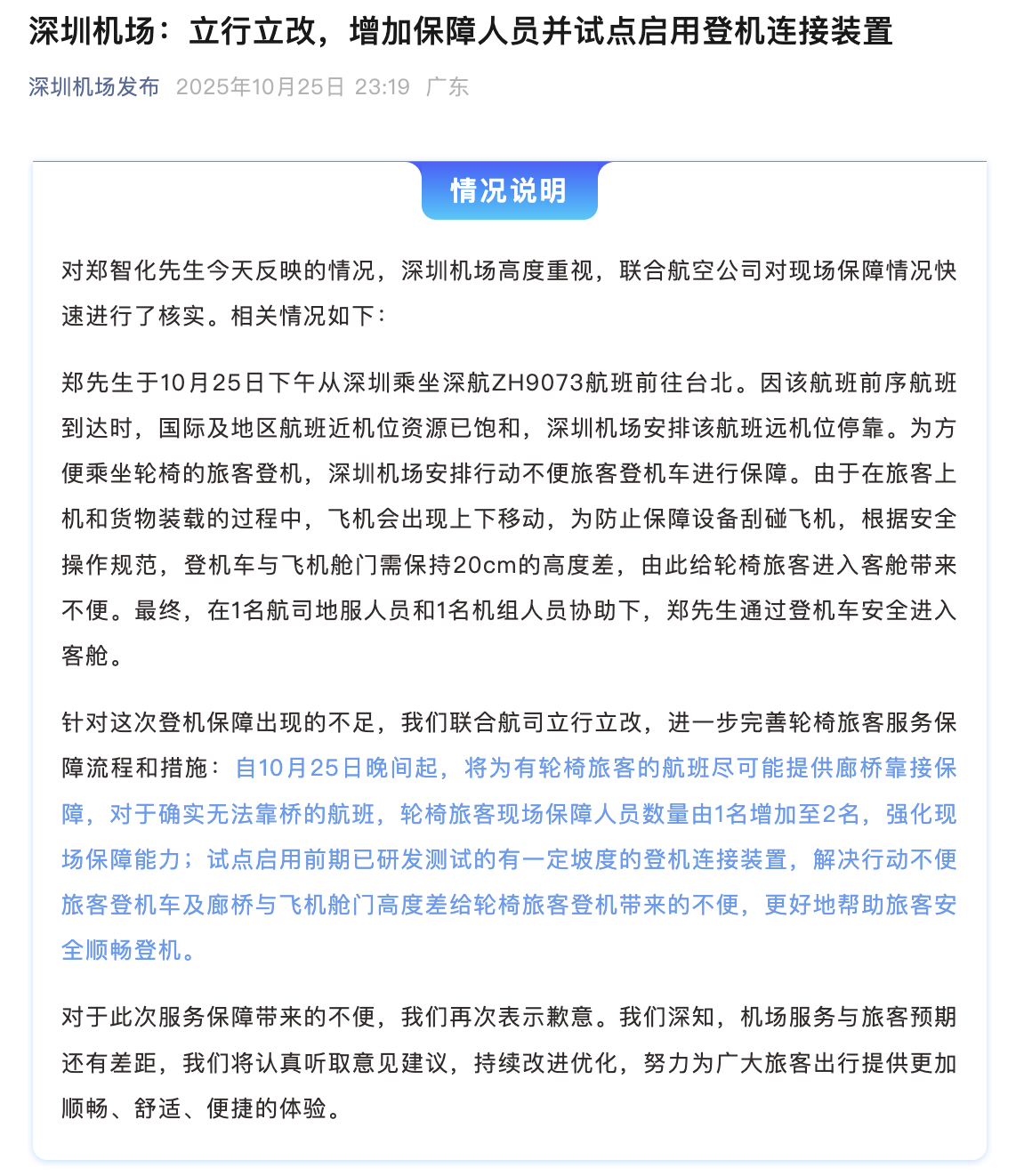 25日晚,“深圳机场发布”微信公众号发文回应。文中表示,针对这次登机保障出现的不足,深圳机场联合航司立行立改,进一步完善轮椅旅客服务保障流程和措施:自10月25日晚间起,将为有轮椅旅客的航班尽可能提供廊桥靠接保障,对于确实无法靠桥的航班,轮椅旅客现场保障人员数量由1名增加至2名,强化现场保障能力;试点启用前期已研发测试的有一定坡度的登机连接装置,解决行动不便旅客登机车及廊桥与飞机舱门高度差给轮椅旅客登机带来的不便,更好地帮助旅客安全顺畅登机。