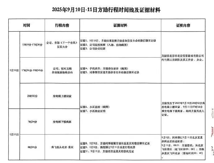 声明中就“于朦胧意外坠楼事件与方励有关”的传言回应称,近期,个别自媒体账号恶意捏造并传播这一虚假信息,毫无事实依据,已严重侵害方励名誉权并造成恶劣影响。律师接受委托后依法开展工作,通过调查取证,已全面核查固定证据(包括监控视频、原始录音文件、即时通讯记录、会议纪要、官方行程确认单、电子登机凭证等),确认了方励在2025年9月10日15:00至9月11日22:40的行程。足以证明方励与该事件毫无关联,相关谣言纯属恶意杜撰,恳请公众切勿轻信。