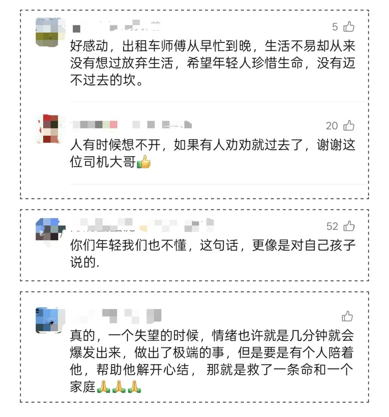 张师傅告诉记者,自己只是做了一件微不足道的小事。“生命脆弱,没有重来的机会。无论遇到什么挫折,都别轻易放弃自己。”对张思东师傅而言,21日的凌晨不过是他无数个夜班中普通的一次,但对后座这个年轻人来说,一个崭新的人生早晨即将随着这城市的苏醒,一同到来。