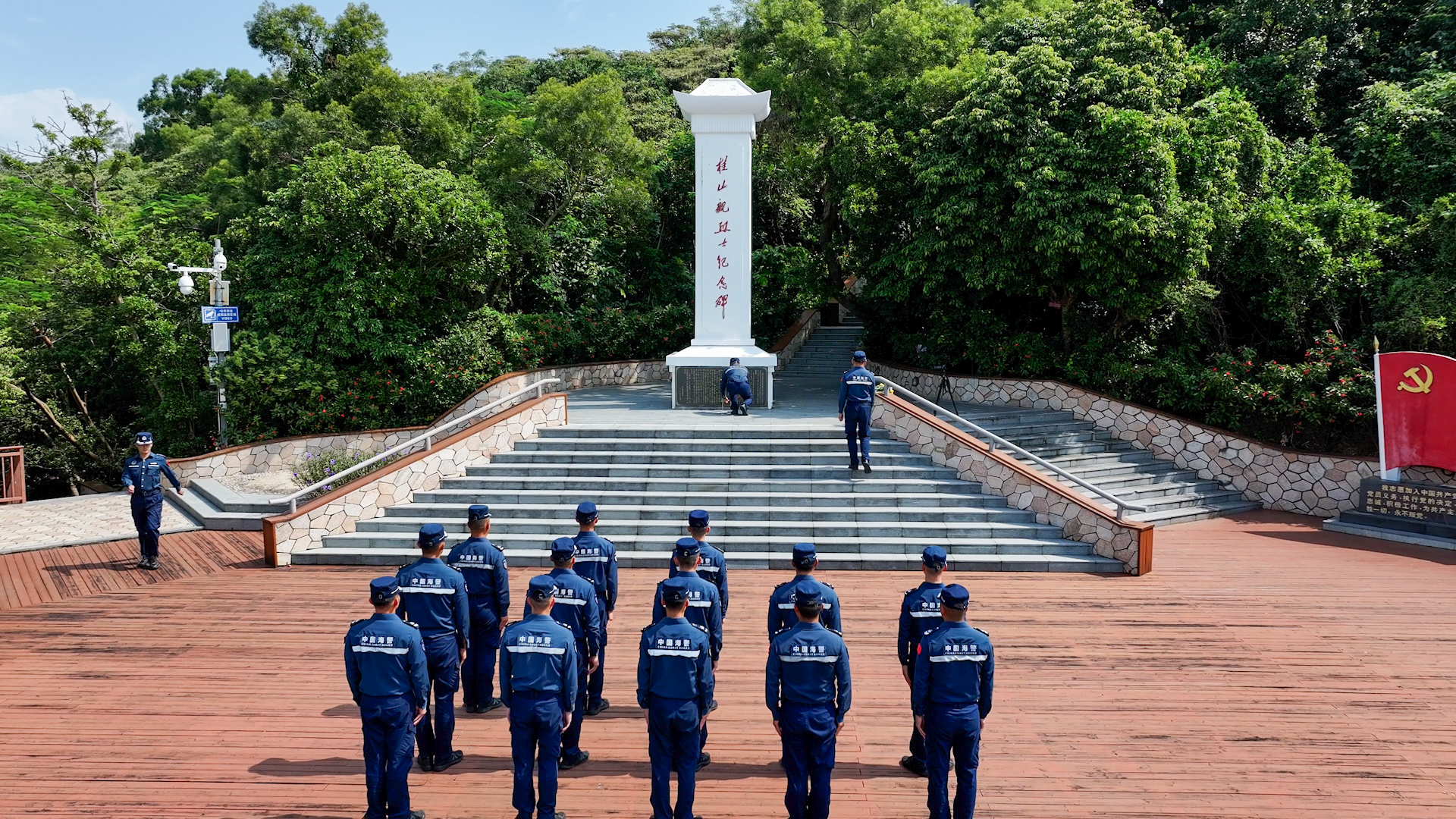 南海之上,汽笛长鸣。海警长榄艇执法员整齐肃立于甲板,脱帽默哀。21声汽笛后,他们向海面抛洒鲜花,祭奠为和平献身的英烈。