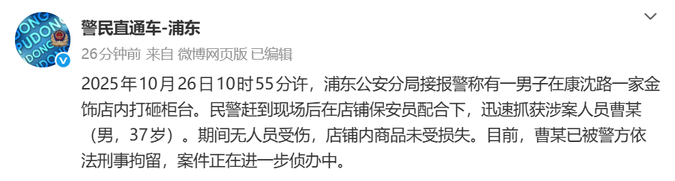 10月26日,@警民直通车-浦东 发布警情通报:2025年10月26日10时55分许,浦东公安分局接报警称有一男子在康沈路一家金饰店内打砸柜台。民警赶到现场后在店铺保安员配合下,迅速抓获涉案人员曹某(男,37岁)。其间无人员受伤,店铺内商品未受损失。目前,曹某已被警方依法刑事拘留,案件正在进一步侦办中。