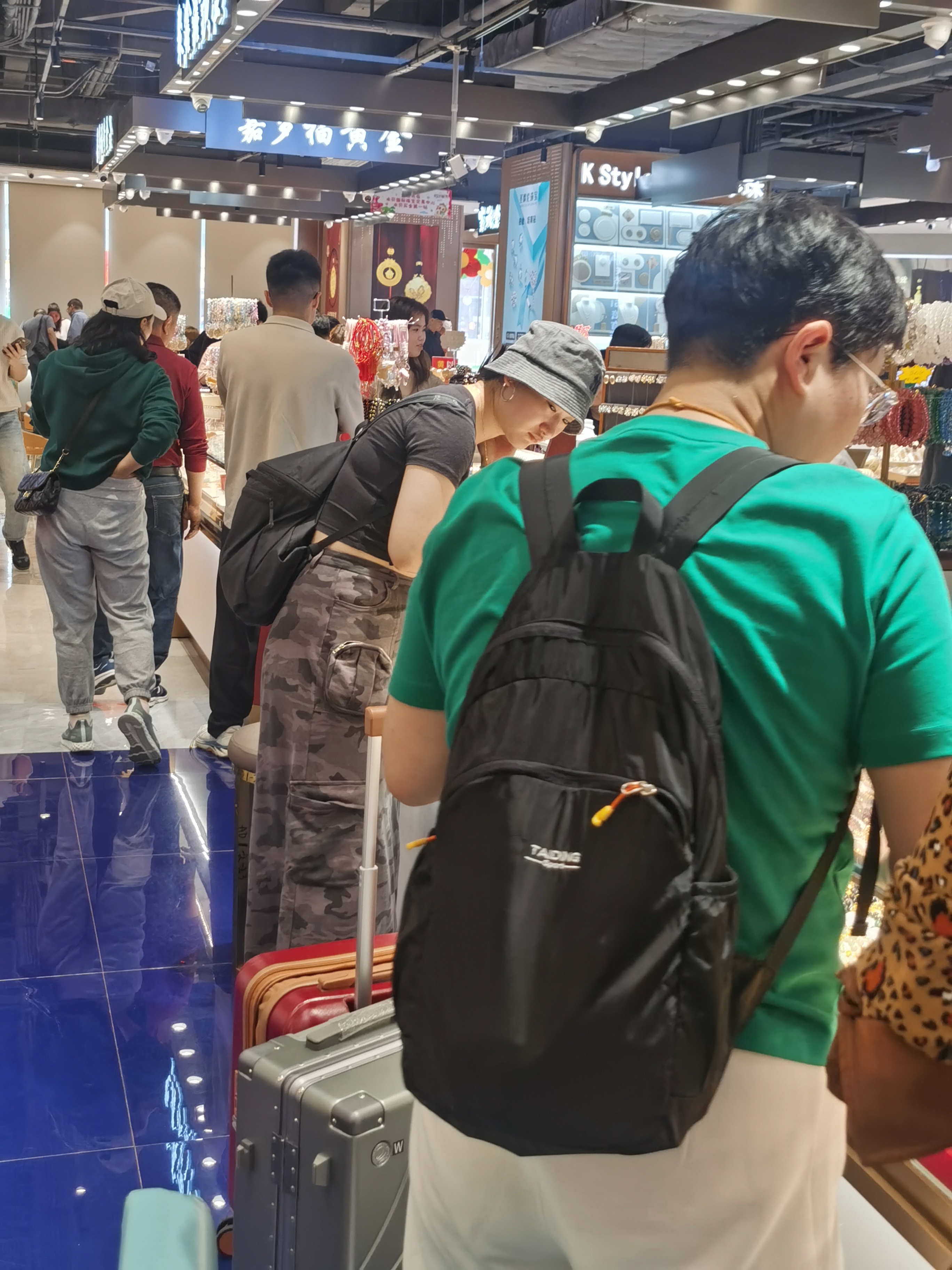 10月24日,周五下午,记者来到水贝黄金市场,即便是工作日下午,不少黄金商铺前依然人流簇拥。有拖着行李箱结伴来选购的外地客,也有翻译随行陪伴的外籍客户,还有父母陪女儿来置换“婚礼三金”等家庭消费客户。