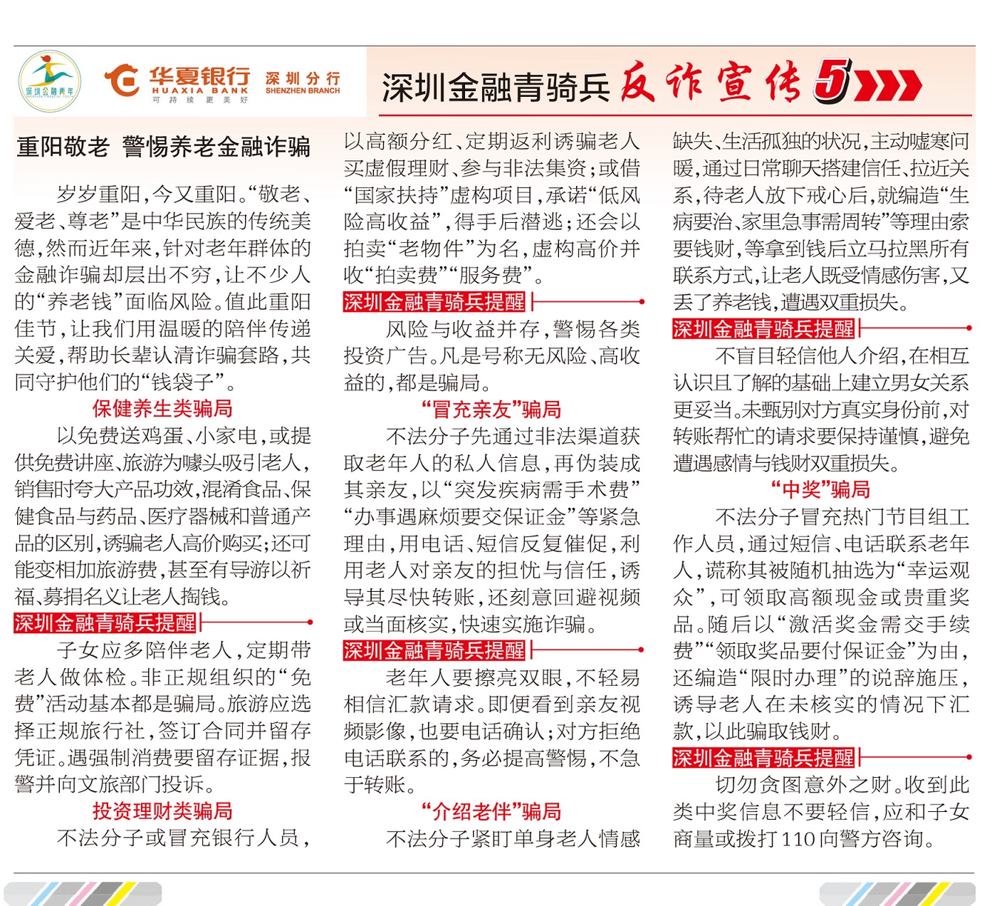 深圳金融青骑兵提醒:风险与收益并存,警惕各类投资广告。凡是号称无风险、高收益的,都是骗局。
