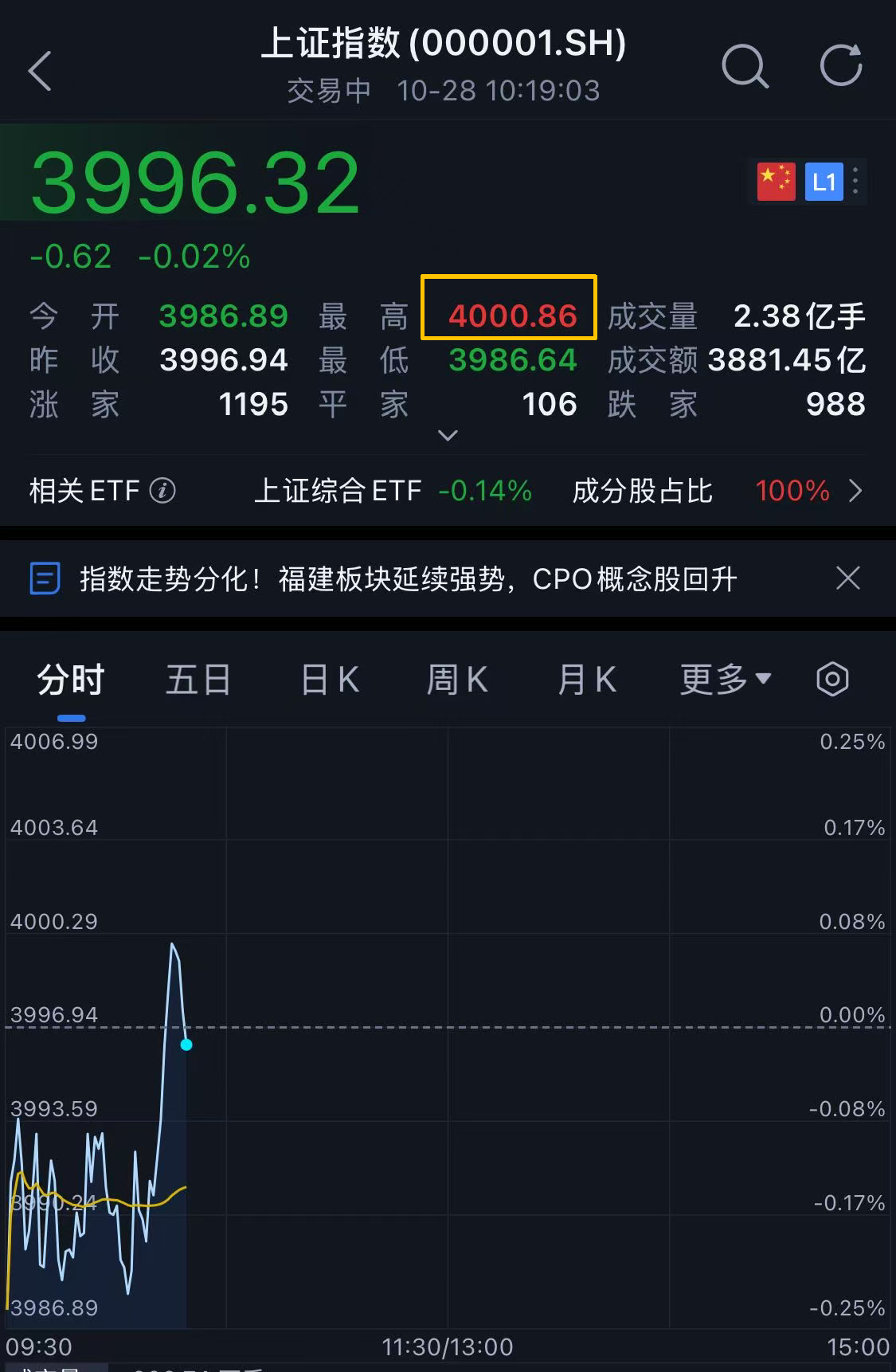 10月28日,盘中沪指震荡走强,突破4000点关口,再创新高!这是自2015年8月18日之后,沪指首次突破4000点。