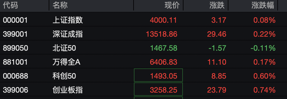 10月28日,A股三大股指集体低开。上证指数开盘跌10.05点,跌幅为0.25%,报3986.89点;深证成指开盘下跌77.73点,跌幅为0.58%,报13411.67点;创业板指开盘下跌29.01点,跌幅为0.9%,报3205.44点;沪深300开盘下跌18.29点,跌幅为0.39%,报4697.73点。盘中沪指持续走强。