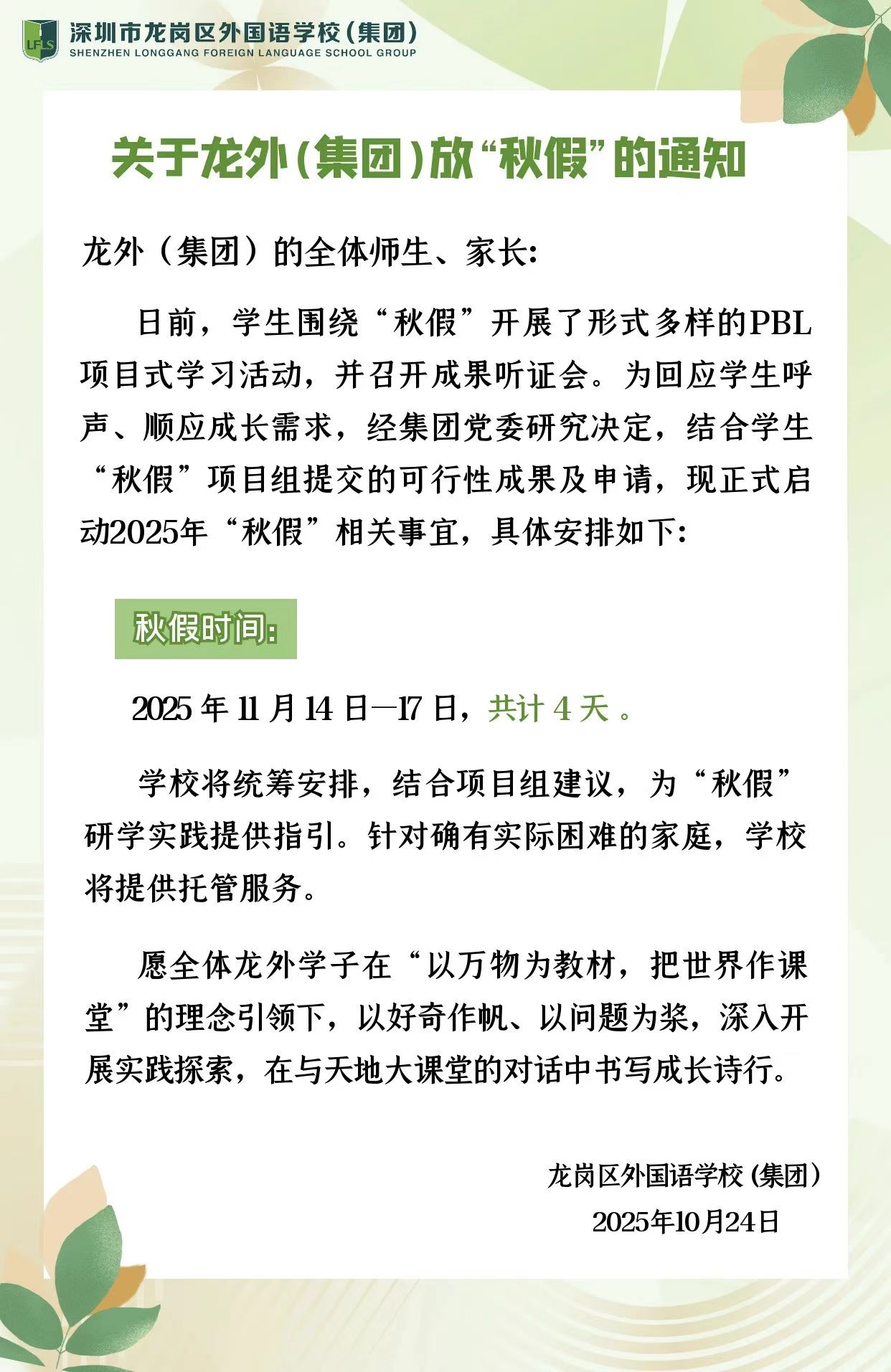 日前,龙岗区外国语学校(集团)发布秋假通知——“为回应学生呼声、顺应成长需求,经集团党委研究决定,正式启动2025年‘秋假’相关事宜。秋假时间为2025年11月14日至17日,共计4天。”记者了解到,针对实施秋假有困难的家庭,龙外(集团)也将提供托管服务。