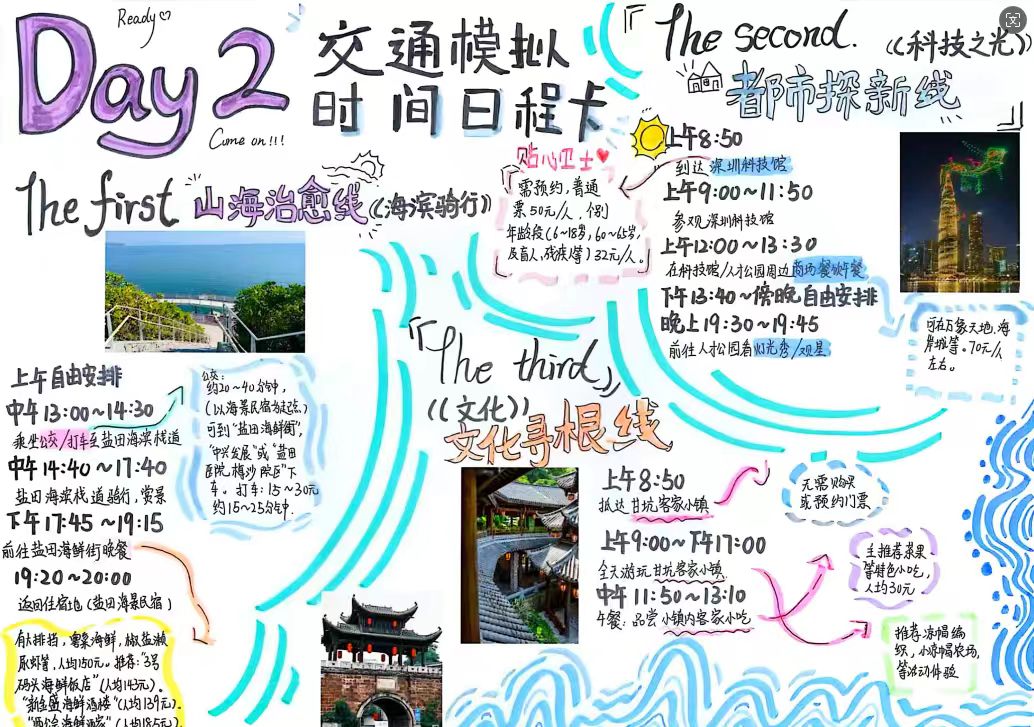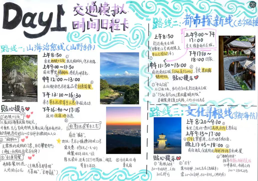 针对“秋假做什么”“会不会让孩子沉迷电子产品?”等家长担忧,探究小组还设计了“秋假攻略”。记者看到,探究小组以手抄报的形式,推荐了山海治愈、都市探新、文化寻根三条短途游路线。想长途游怎么办?探究小组也策划了一条荆楚文化路线。四天行程涵盖省博珍品、黄鹤楼诗境、武大红色基因与古城三国风云。经AI精准预算,人均费用不超过2000元,可以实现“花得少、玩得好、学得多”的秋假深度研学体验。如果不想旅游,居家也能过得充实有趣。探究小组设计了四个主题日——家味记忆馆日、家庭CEO轮岗日、家庭戒网日、DIY手工日,将日常相处转化为高质量的亲密陪伴。