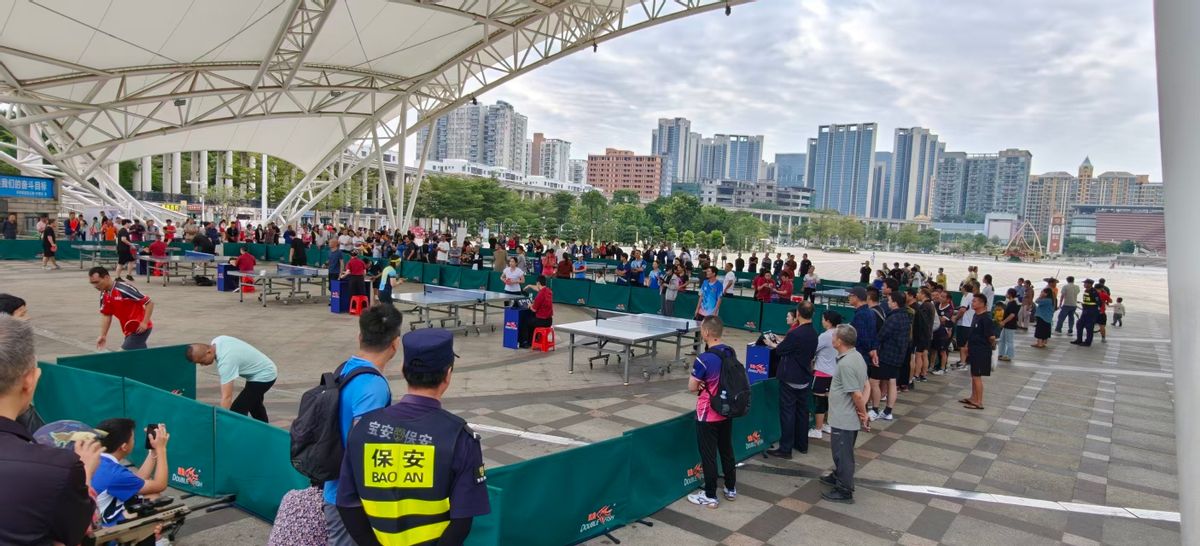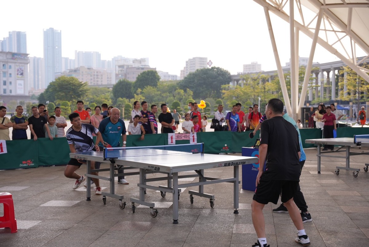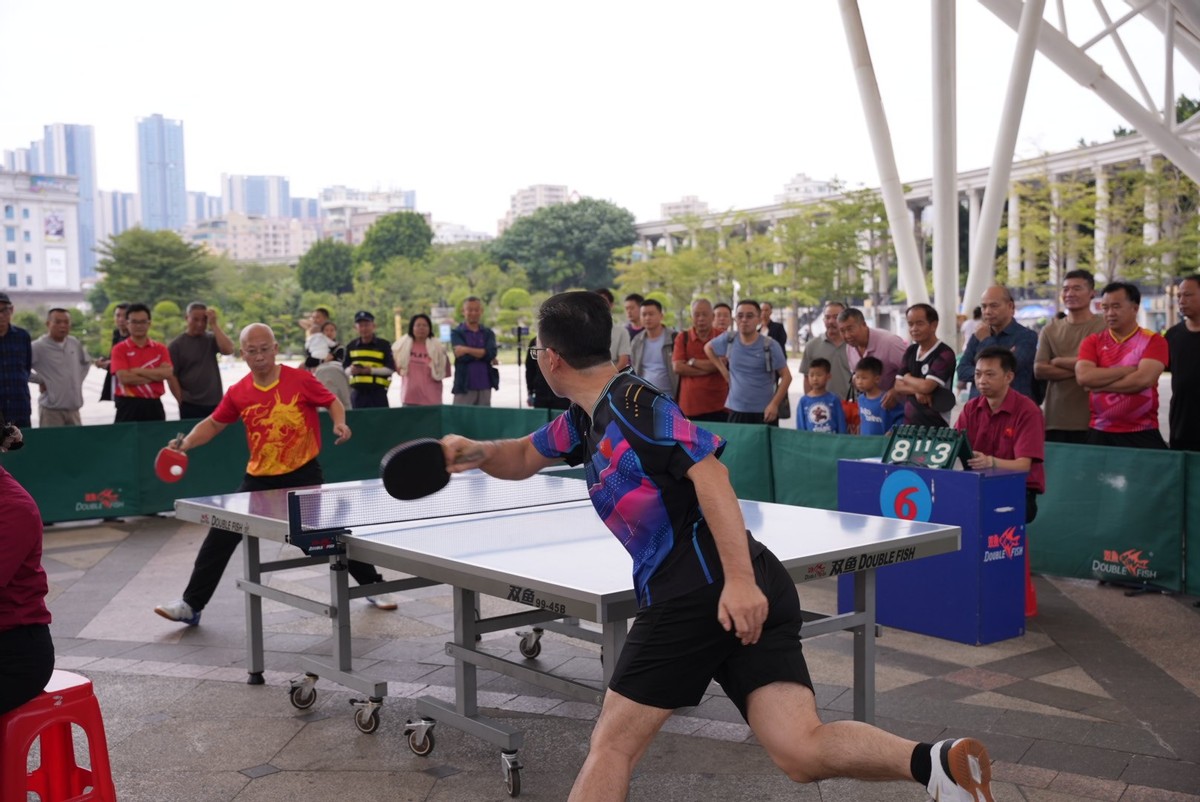 现场,十张乒乓球台两列排开,市民广场开放式空间举行比赛,让更多市民朋友能够近距离感受乒乓球的魅力。赛场上大家比拼得热闹,赛场外围观的市民群众也看得过瘾。从早上8点半开始,至下午5点半,全天候的比赛包括男女单打和混合团体赛,来自辖区物业小区组队的23支队伍123名选手参赛。当天的赛事安排十分紧凑,全天比赛170多场次,由宝安区乒协裁判团队专业指导开展。